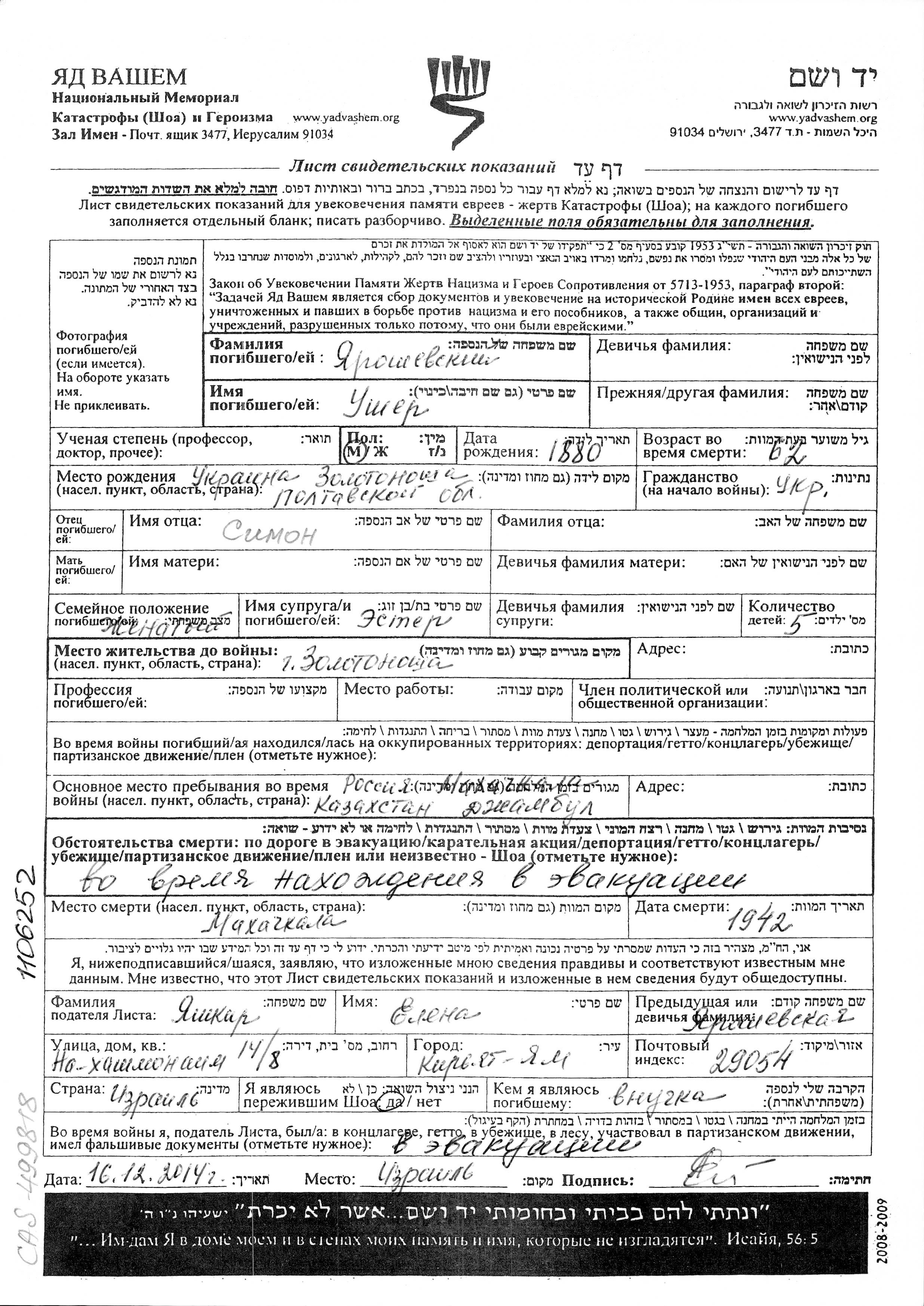 Ушер Ярошевский, место рождения: Золотоноша, Украина (СССР). Товаровед. Место жительства до войны: Золотоноша, Украина (СССР). Ушер был/а зарегистрирован/а, находясь в эвакуации/ в советском тылу.