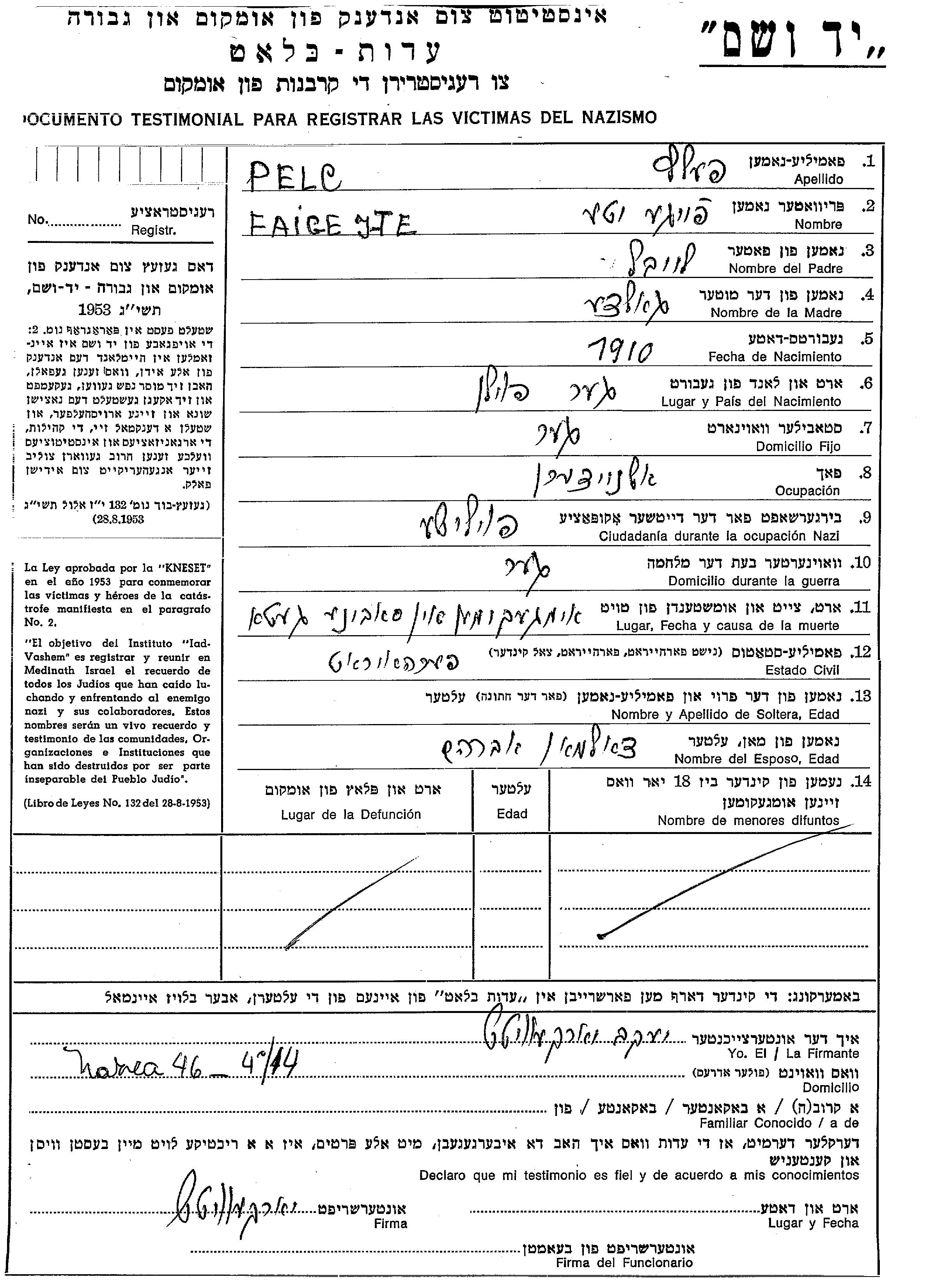 Пельц Файге Ите 1910 Гер, Польша Лист свидетельских показаний