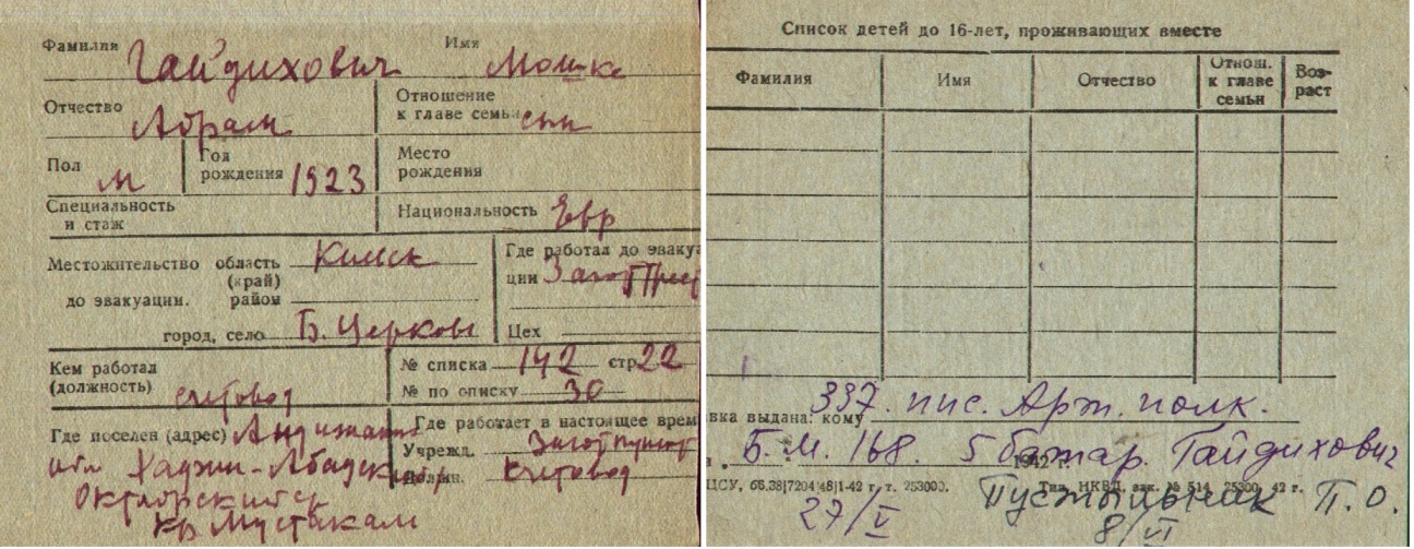 Гайдихович Мошка 1923 Белая Церковь, Украина (СССР) Список эвакуированных