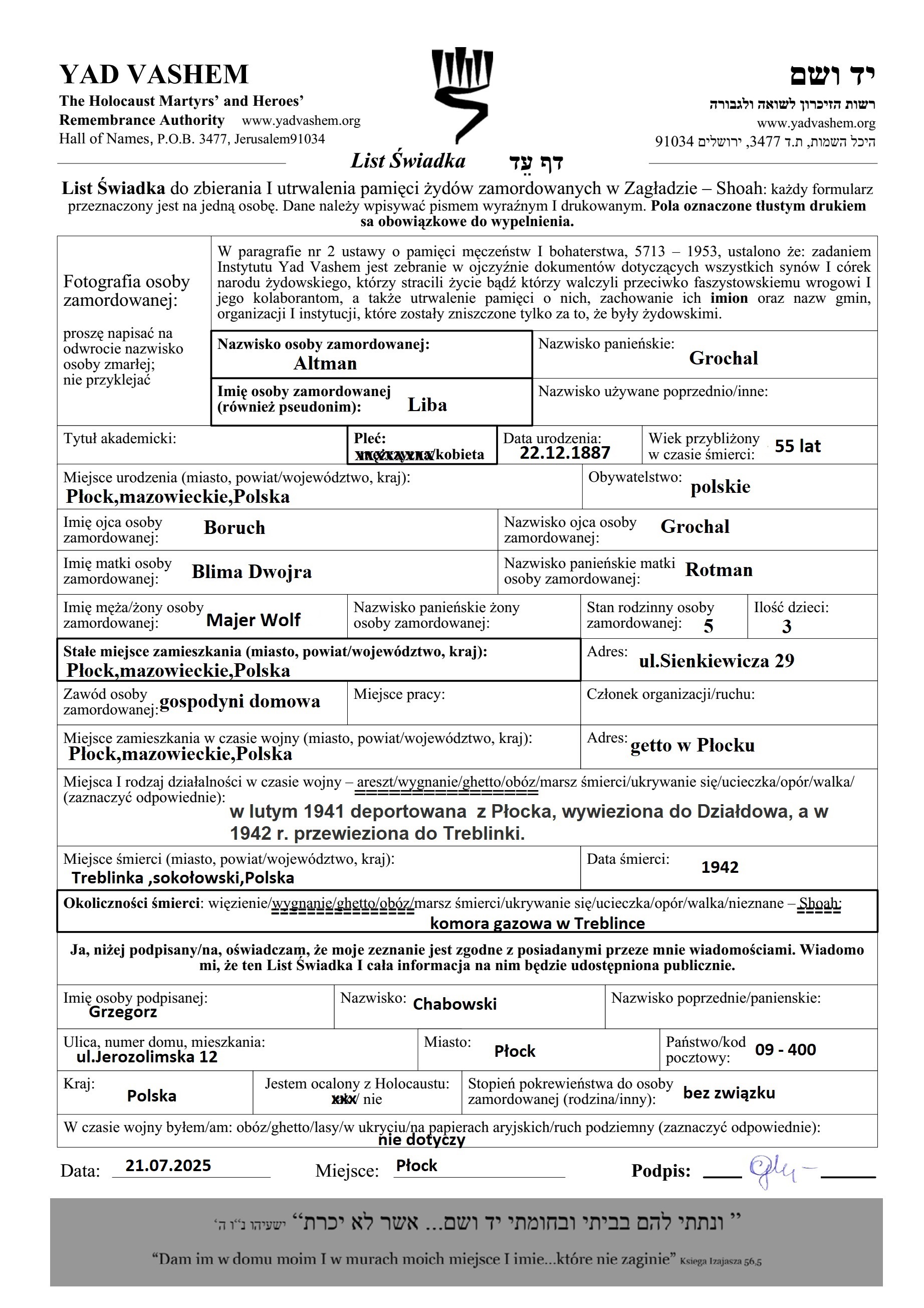 Либа Альтман, девичья фамилия Грохаль, место рождения: Плоцк, Польша. Домохозяйка. Место жительства до войны: Плоцк, Польша. Либа уничтоженa в период Шоа. место смерти: Треблинка, Польша в 1942.