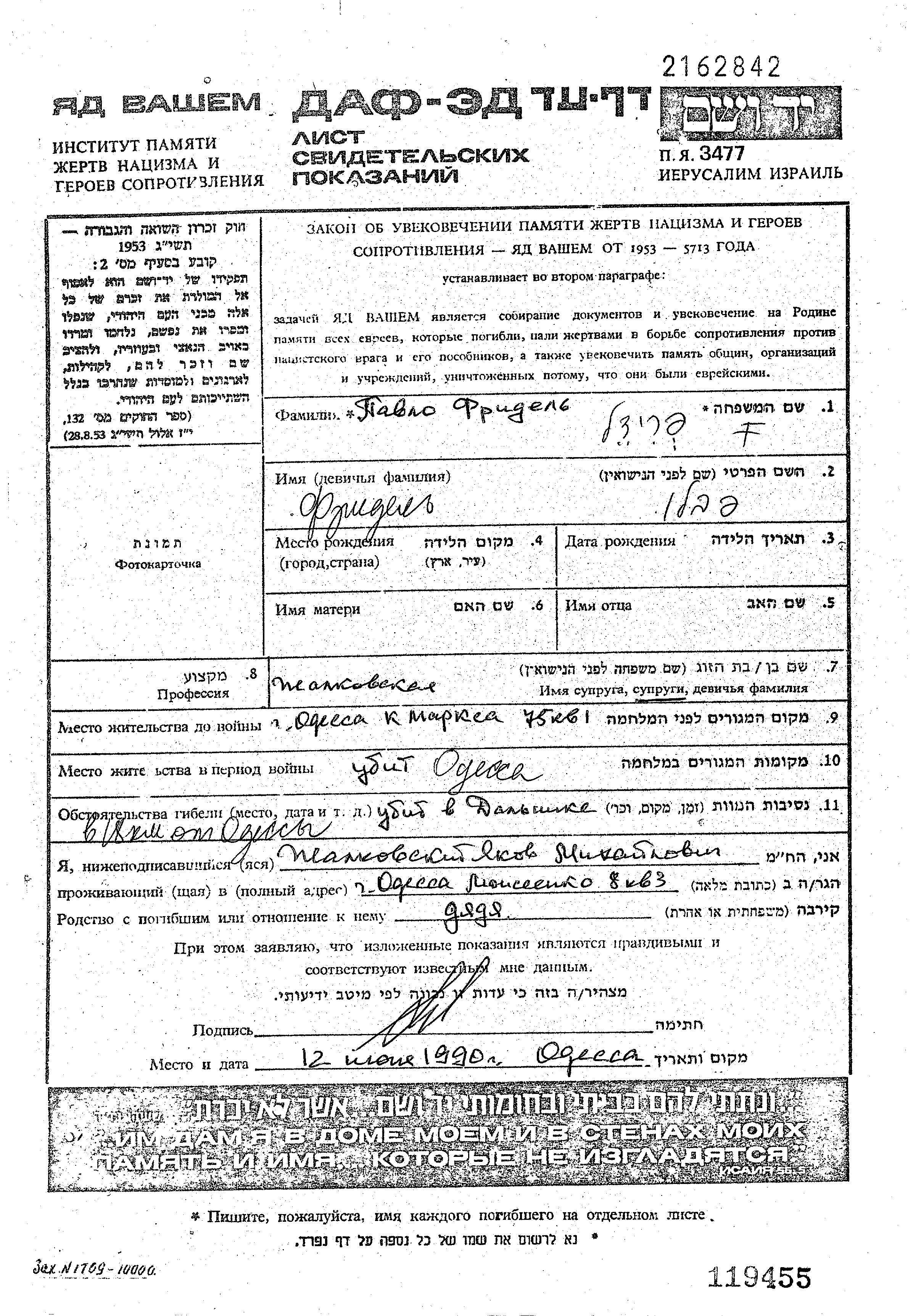 Павло Фридл 1887 Одесса, Украина (СССР) Лист свидетельских показаний