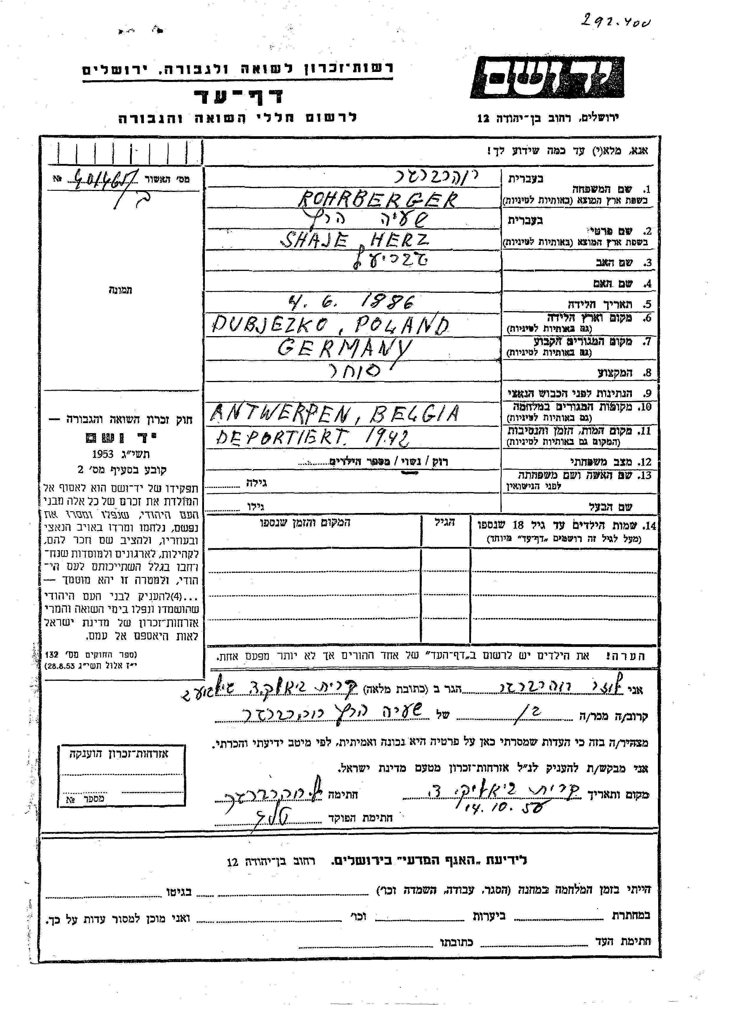 Шае Херц Рорбергер, место рождения: Дубецко, Польша. Отец: Габриэль. Торговец / торговка. Женат / замужем. Место жительства до войны: Германия. Место во время войны: Антверпен, Бельгия.