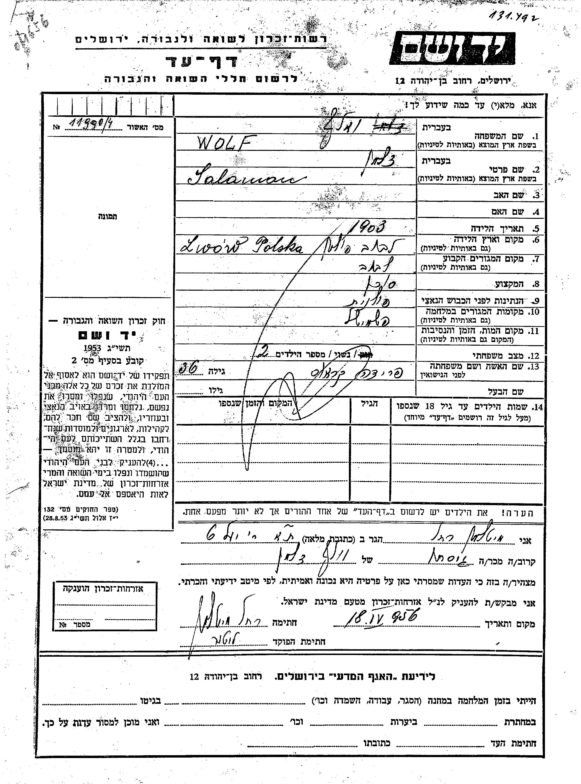 Вольф Саламан Цальман 1903 Львов, Польша Лист свидетельских показаний
