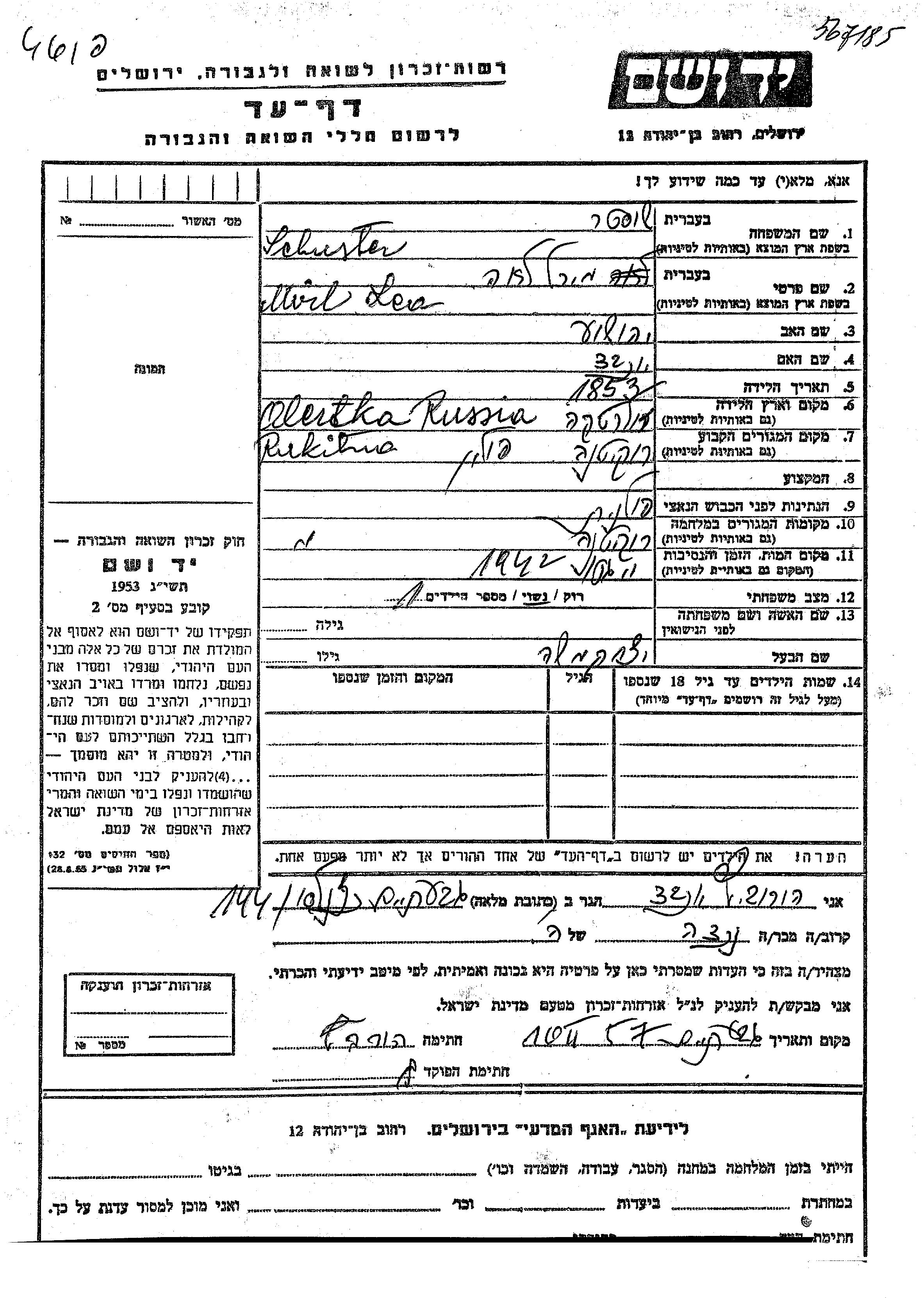 Мирл Лея Шустер, место рождения: Россия (СССР). Отец: Иегошуа, mать:Йохевед. Женат / замужем. Место жительства до войны: Рокитное, Польша. Место во время войны: Рокитное, Польша.