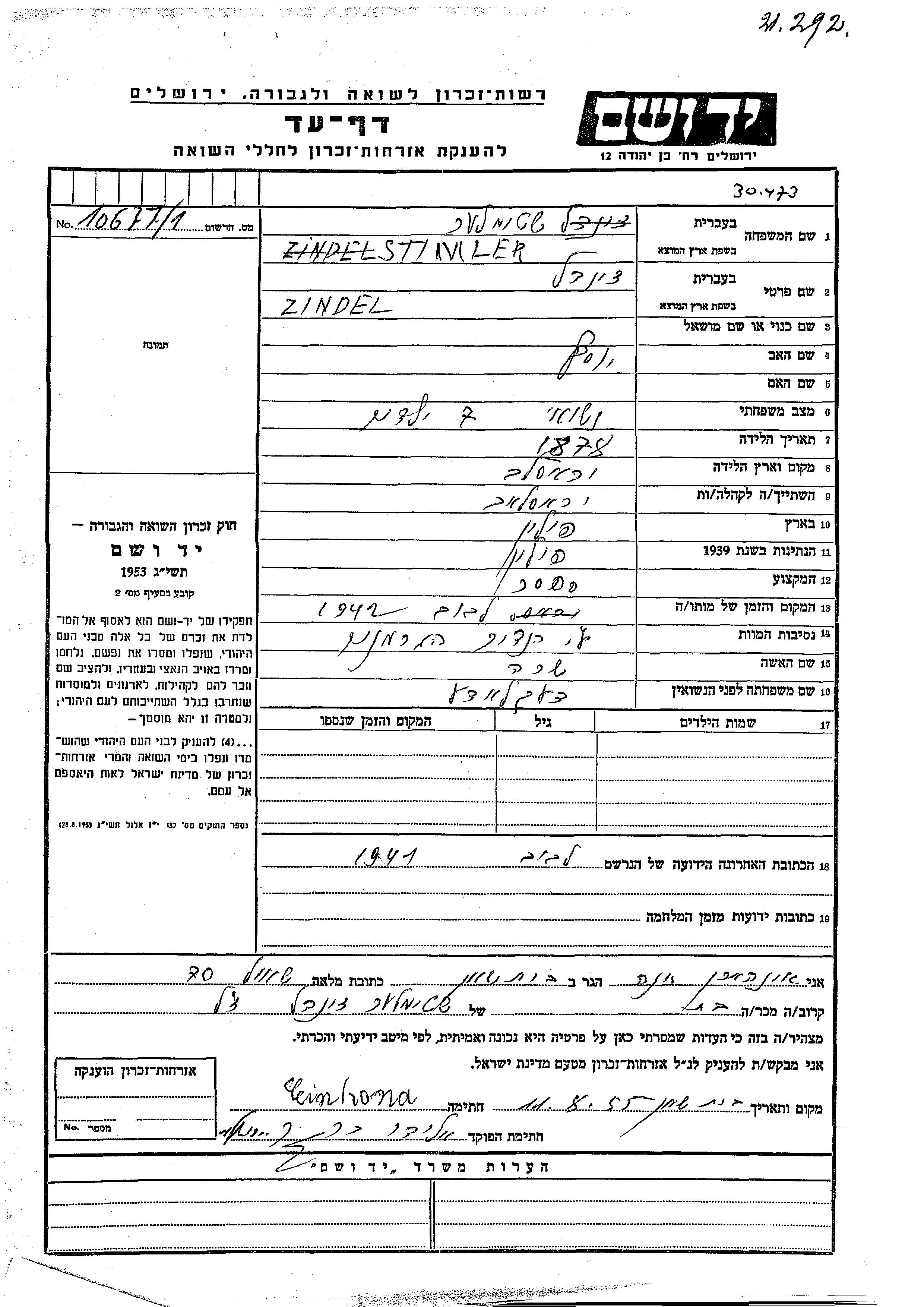 Зиндель Штимлер, место рождения: Ярослав, Польша. Отец: Иосеф. Перекупщик. Женат / замужем. Место жительства до войны: Ярослав, Польша.