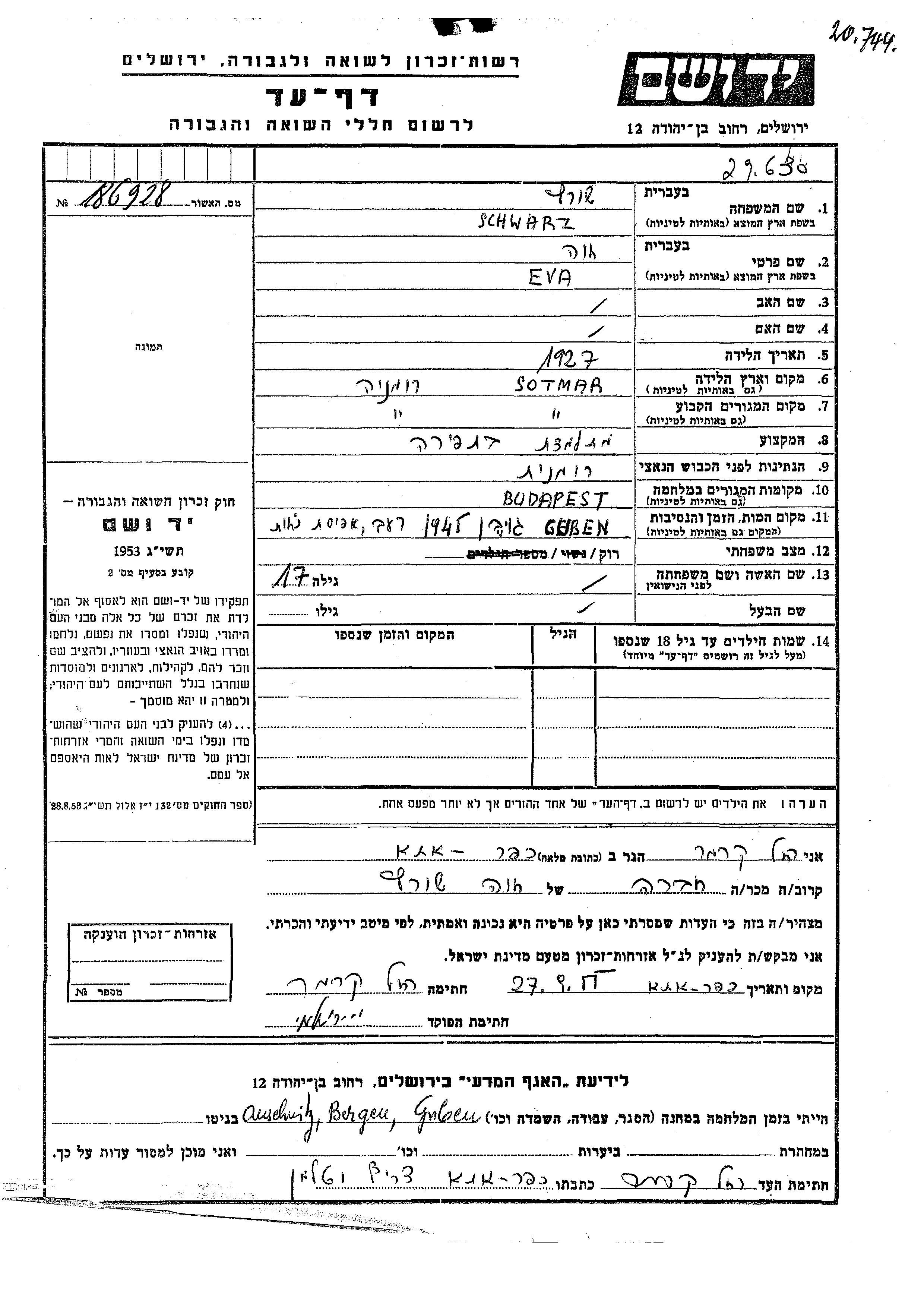 Шварц Эва Хава 1927 Сотмар, Румыния Лист свидетельских показаний