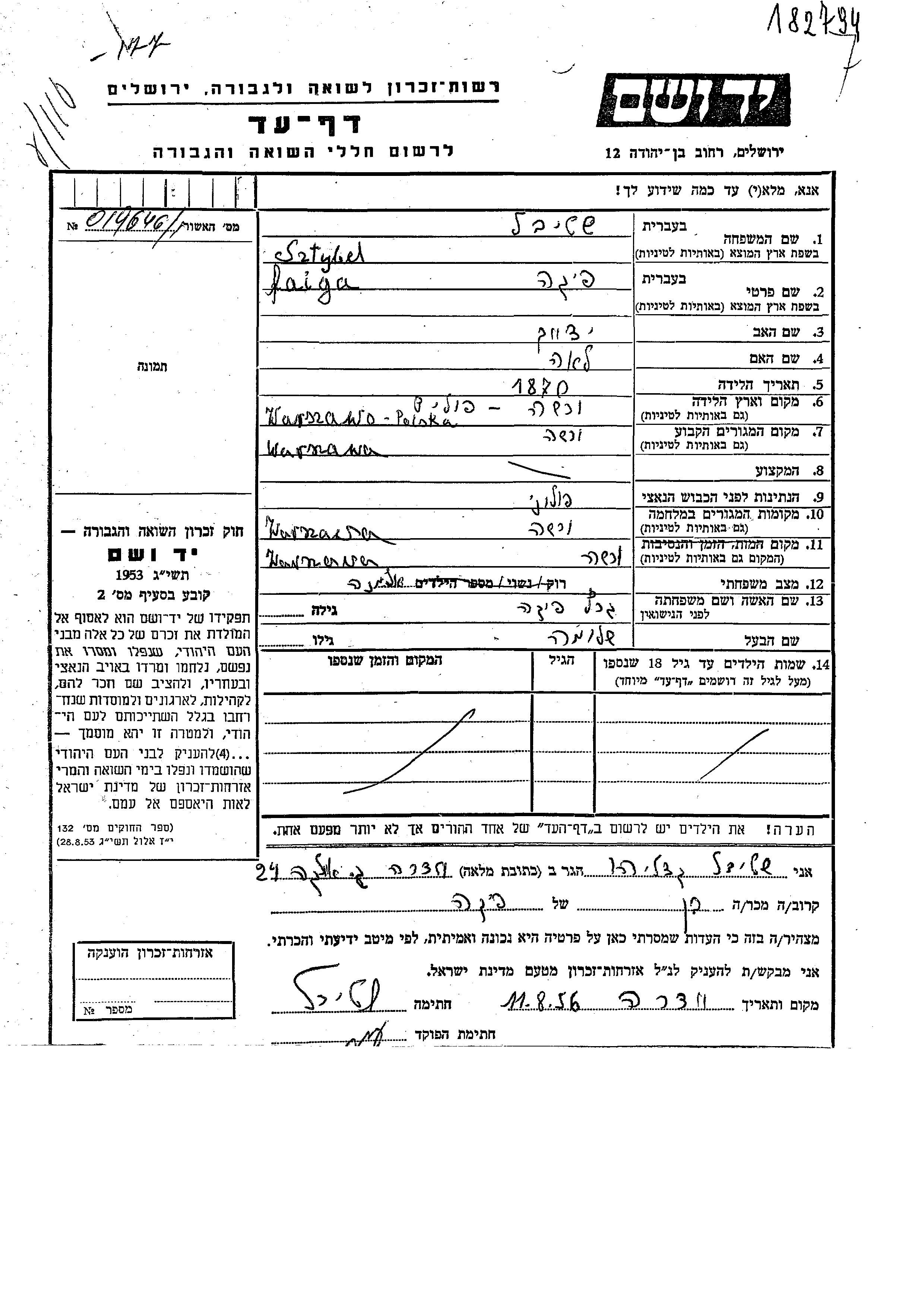 Файга Штыбель, девичья фамилия Герц, место рождения: Варшава, Польша. Отец: Ицхак, mать:Лея. Вдова. Место жительства до войны: Варшава, Польша. Место во время войны: Варшава, Польша.