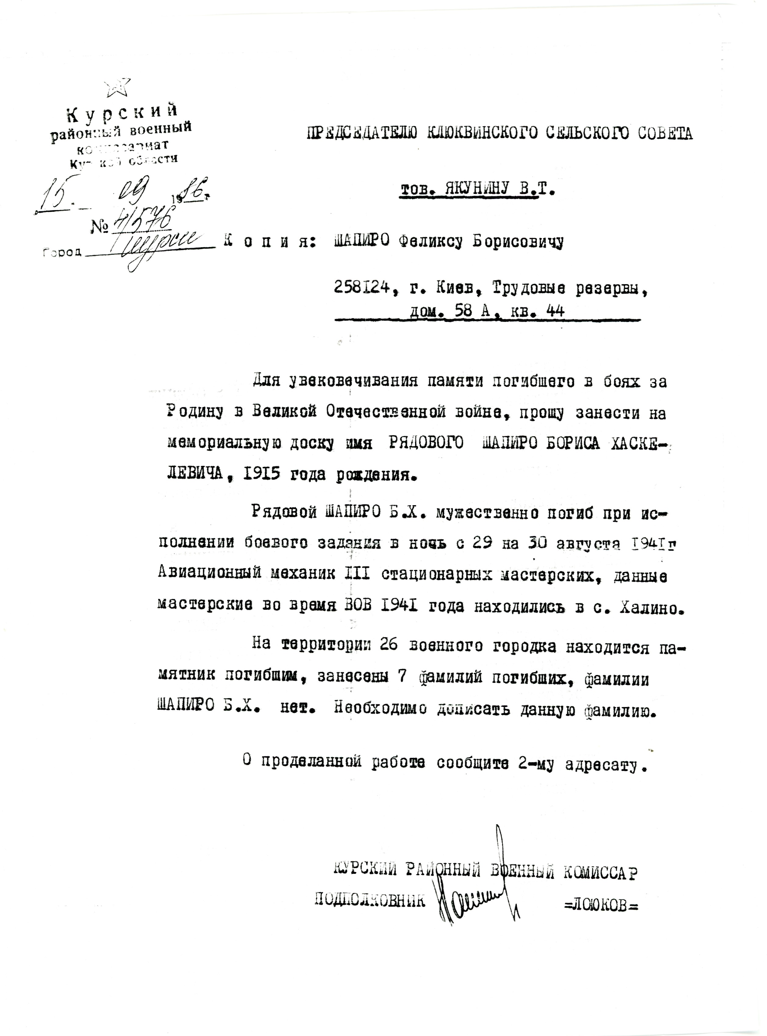 Борис Шапиро, место рождения: Киев, Украина (СССР). Механик. Место жительства до войны: Киев, Украина (СССР).