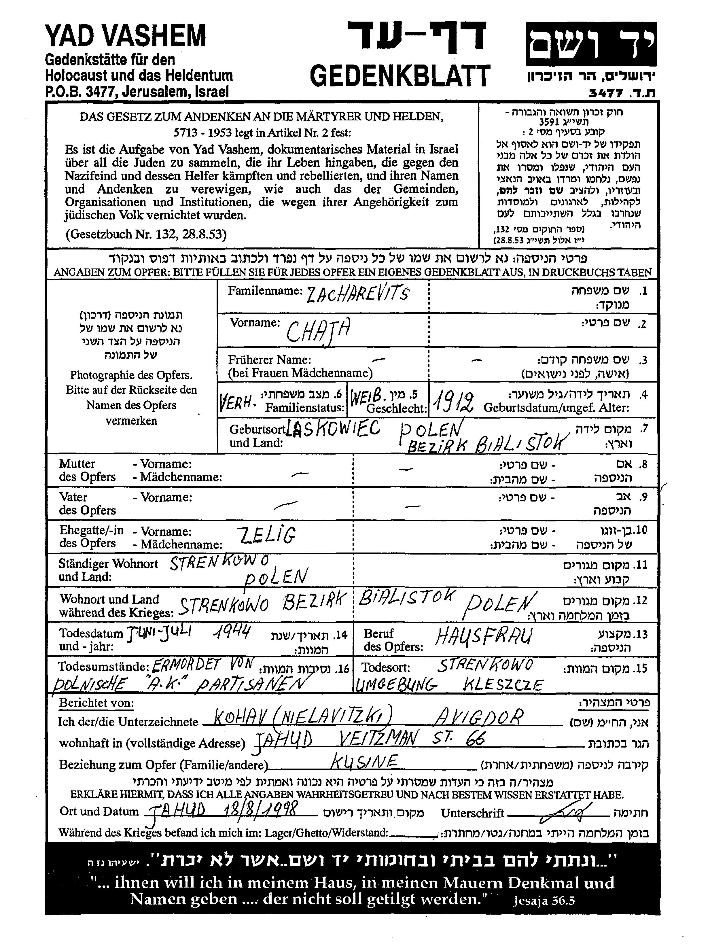 Хая Захаревиц, место рождения: Ласковец, Польша. Домохозяйка. Женат / замужем. Место жительства до войны: Стренково, Польша. Место во время войны: Стренково, Польша.