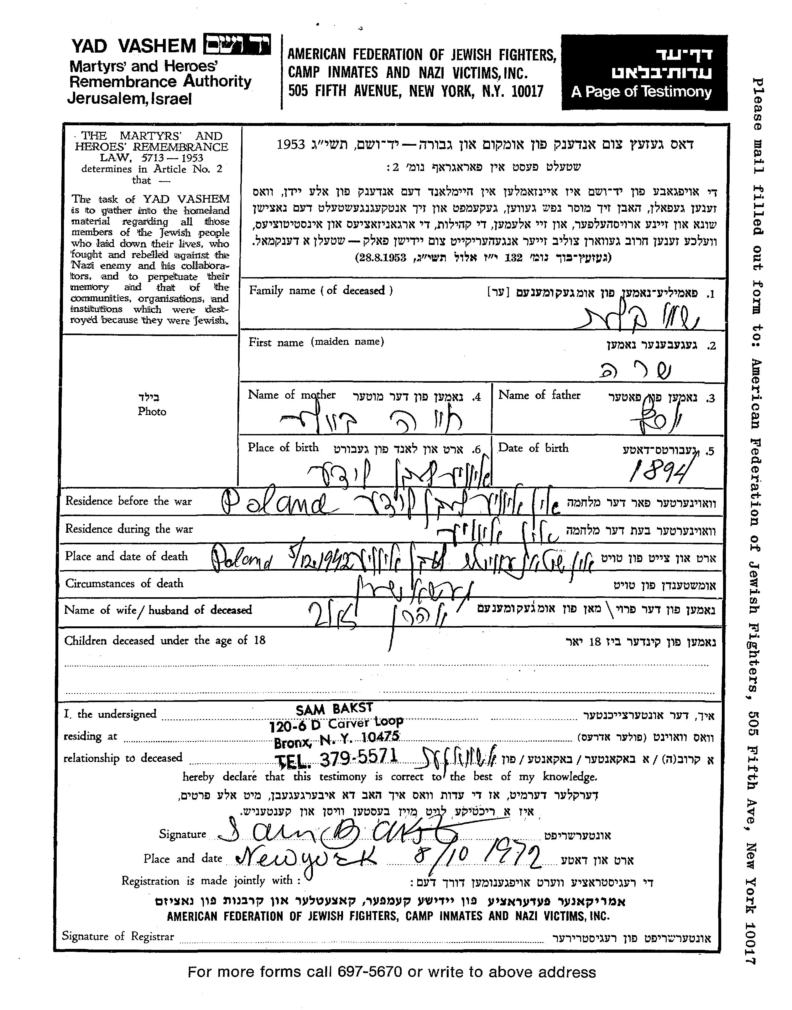 Яд Вашем - Листы свидетельских показаний Мемориального фонда