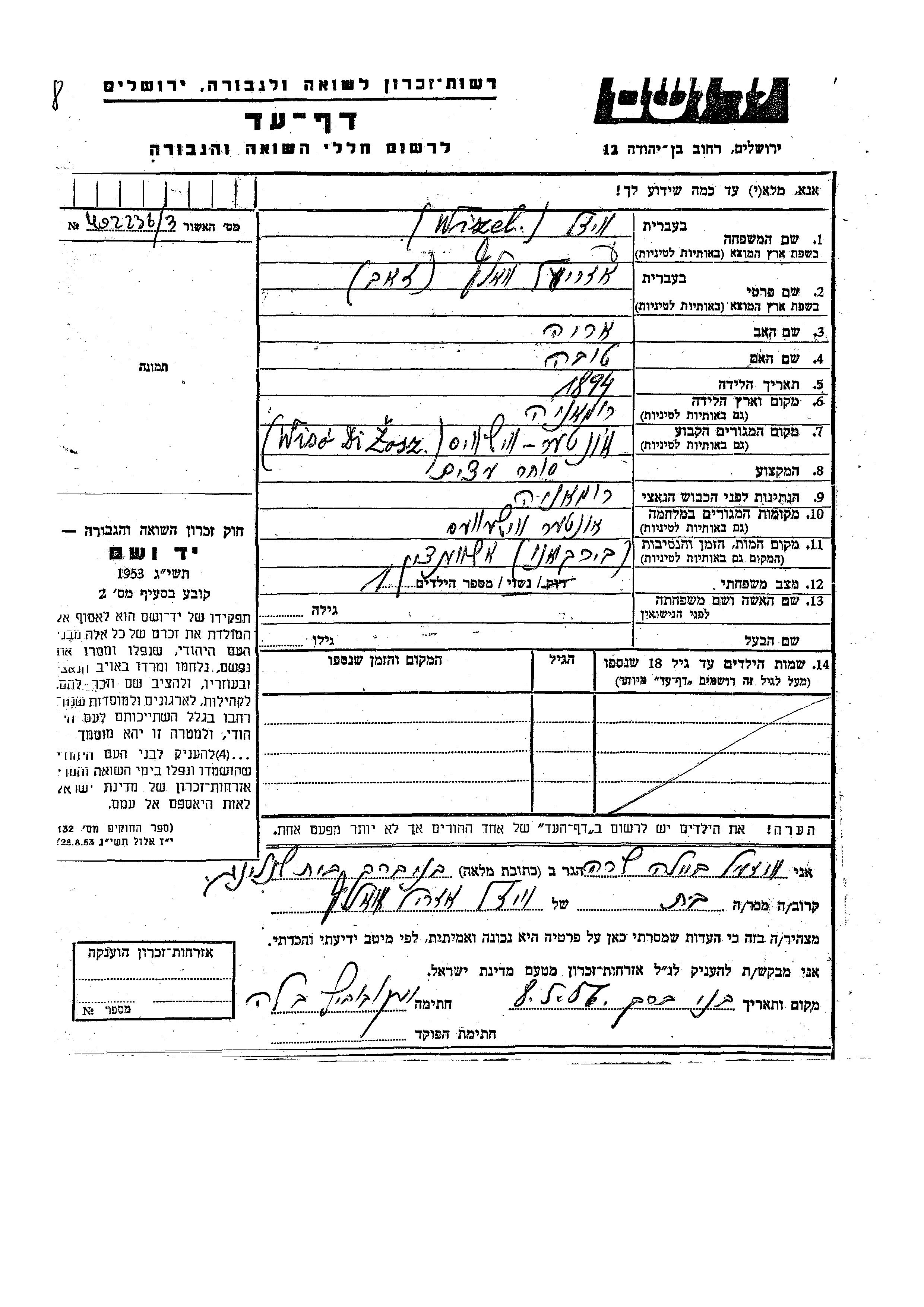 Визель Азриэль Зеев 1894 Вишо, Румыния Лист свидетельских показаний