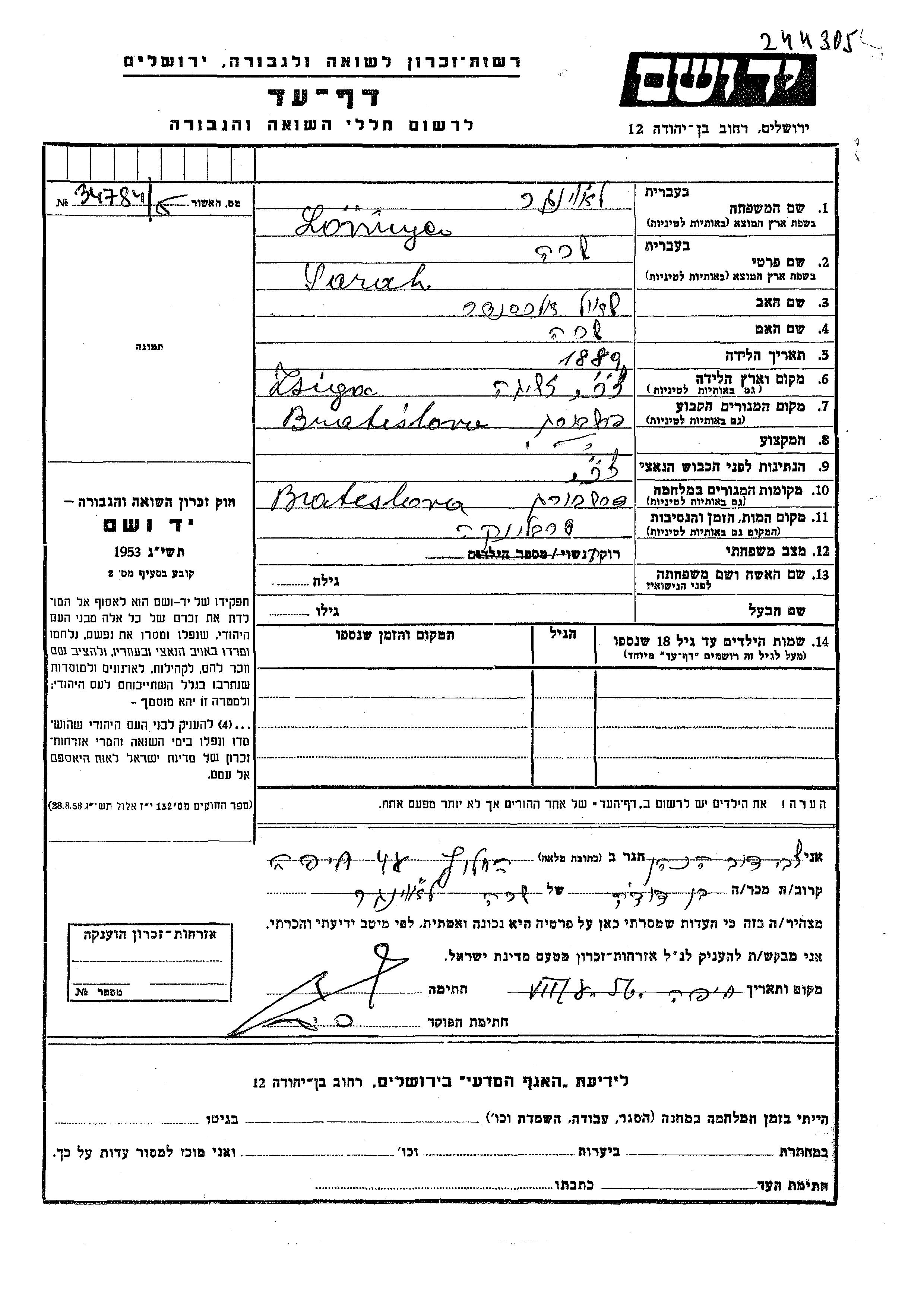 Лёвингер Сара 1889 Братислава, Чехословакия Лист свидетельских показаний