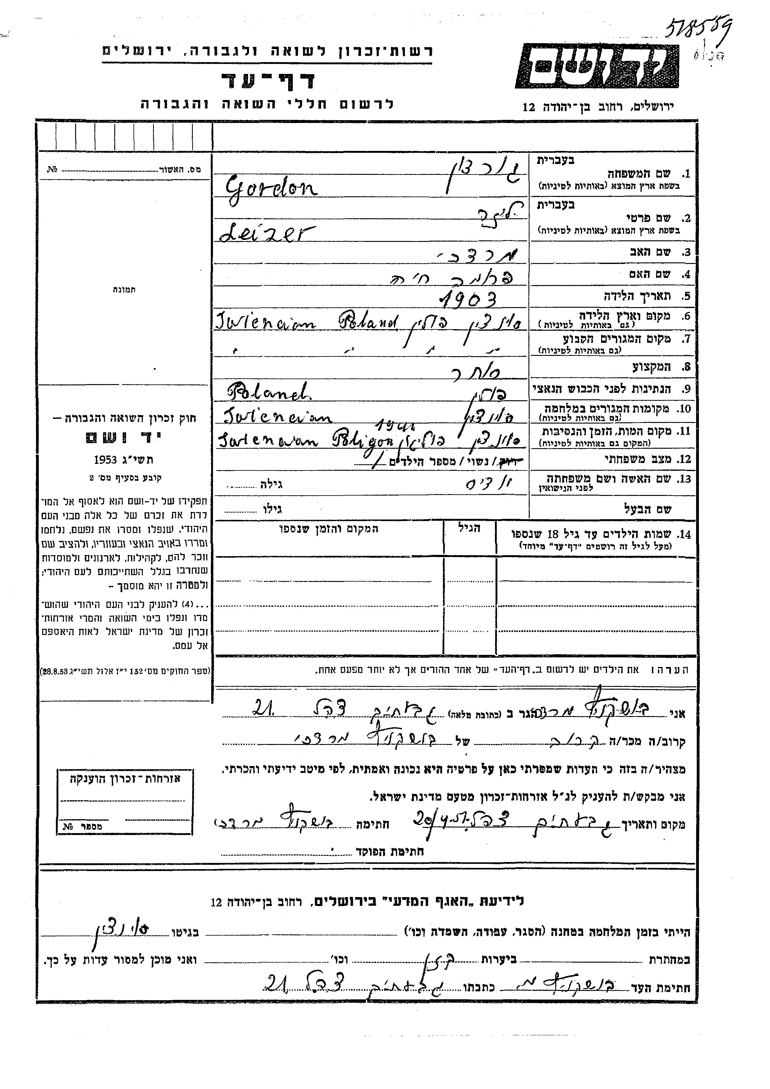 Лейзер Гордон, место рождения: Ивенец, Польша. Отец: Мордехай, mать:Фрума Хая. Торговец / торговка. Женат / замужем. Место жительства до войны: Ивенец, Польша. Место во время войны: Ивенец, Польша.