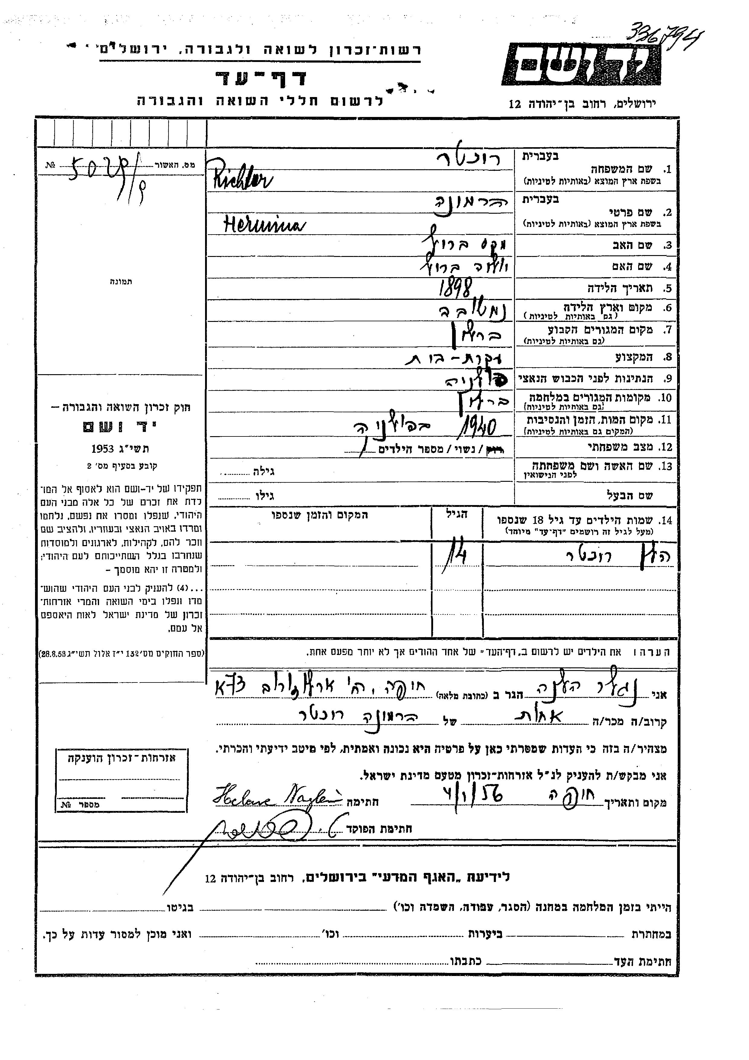 Хермина Рихтер, девичья фамилия Бриц, место рождения: Германия. Отец: Макс, mать:Юлия. Домохозяйка. Женат / замужем. Место жительства до войны: Берлин, Германия. Место во время войны: Берлин, Германия.