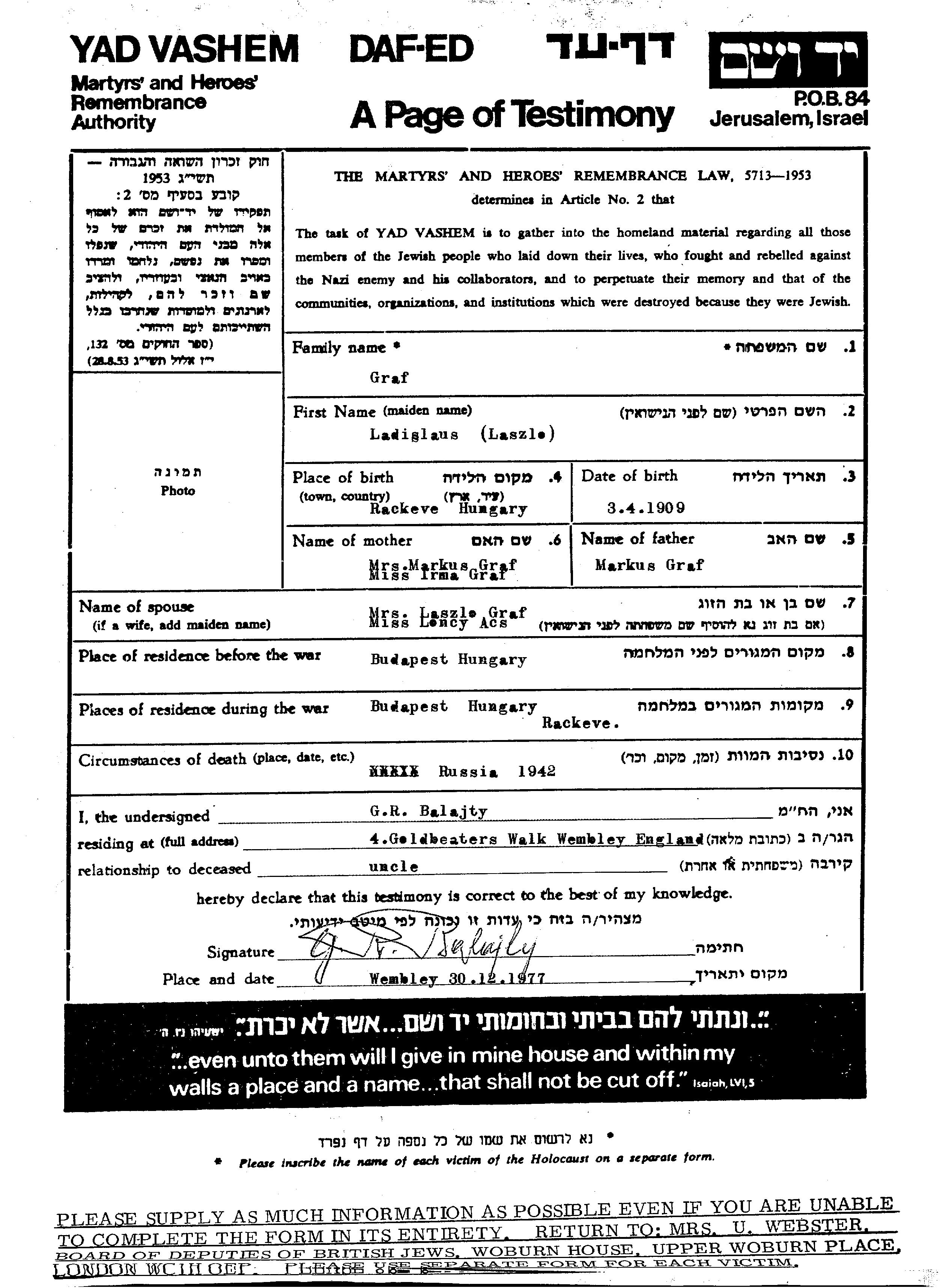 Ладислаус Граф, место рождения: Рацкеве, Венгрия. Отец: Маркус, mать:Ирма. Женат / замужем. Место жительства до войны: Будапешт, Венгрия. Место во время войны: Будапешт, Венгрия.