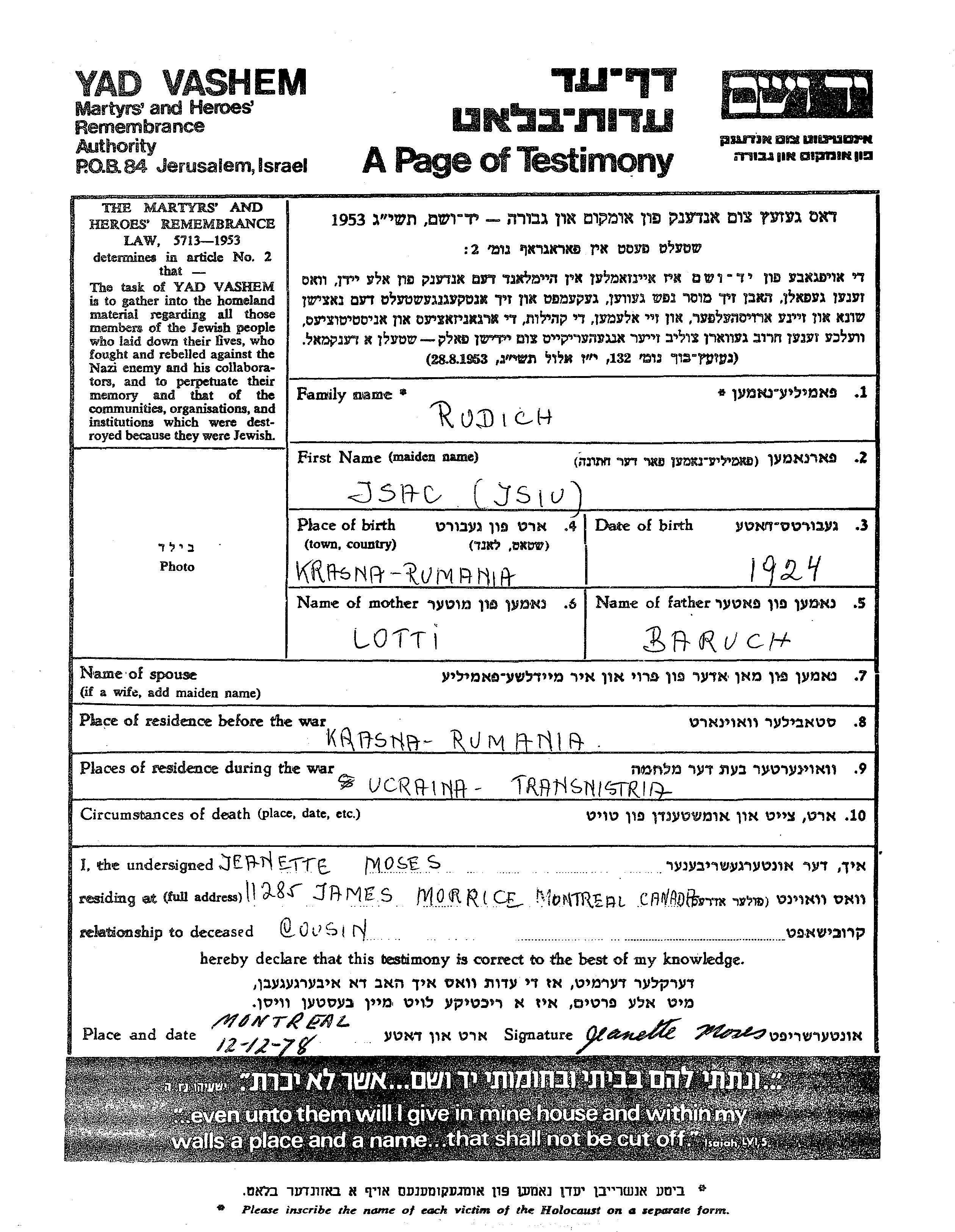 Рудих Исак Исиу 1924 Красна, Румыния Лист свидетельских показаний