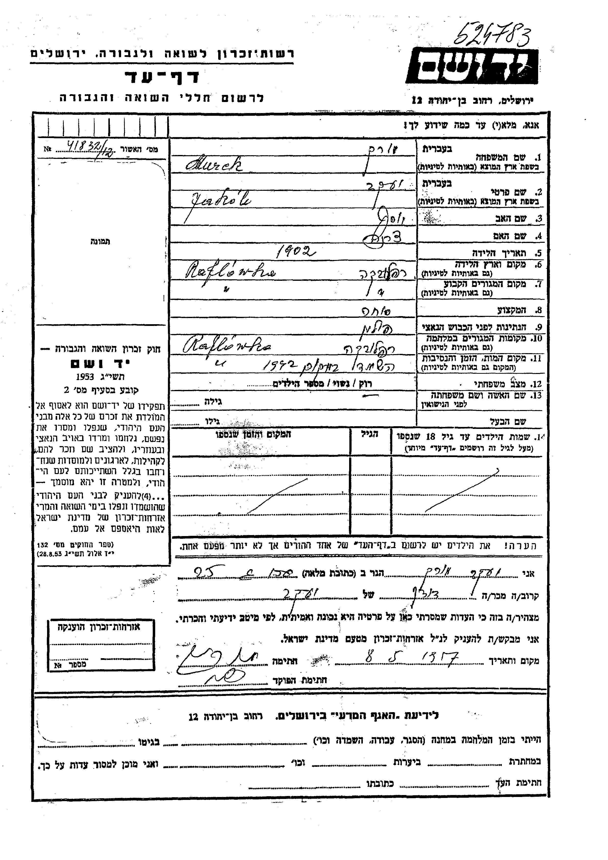 Мурек Якоб 1902 Рафаловка, Польша Лист свидетельских показаний