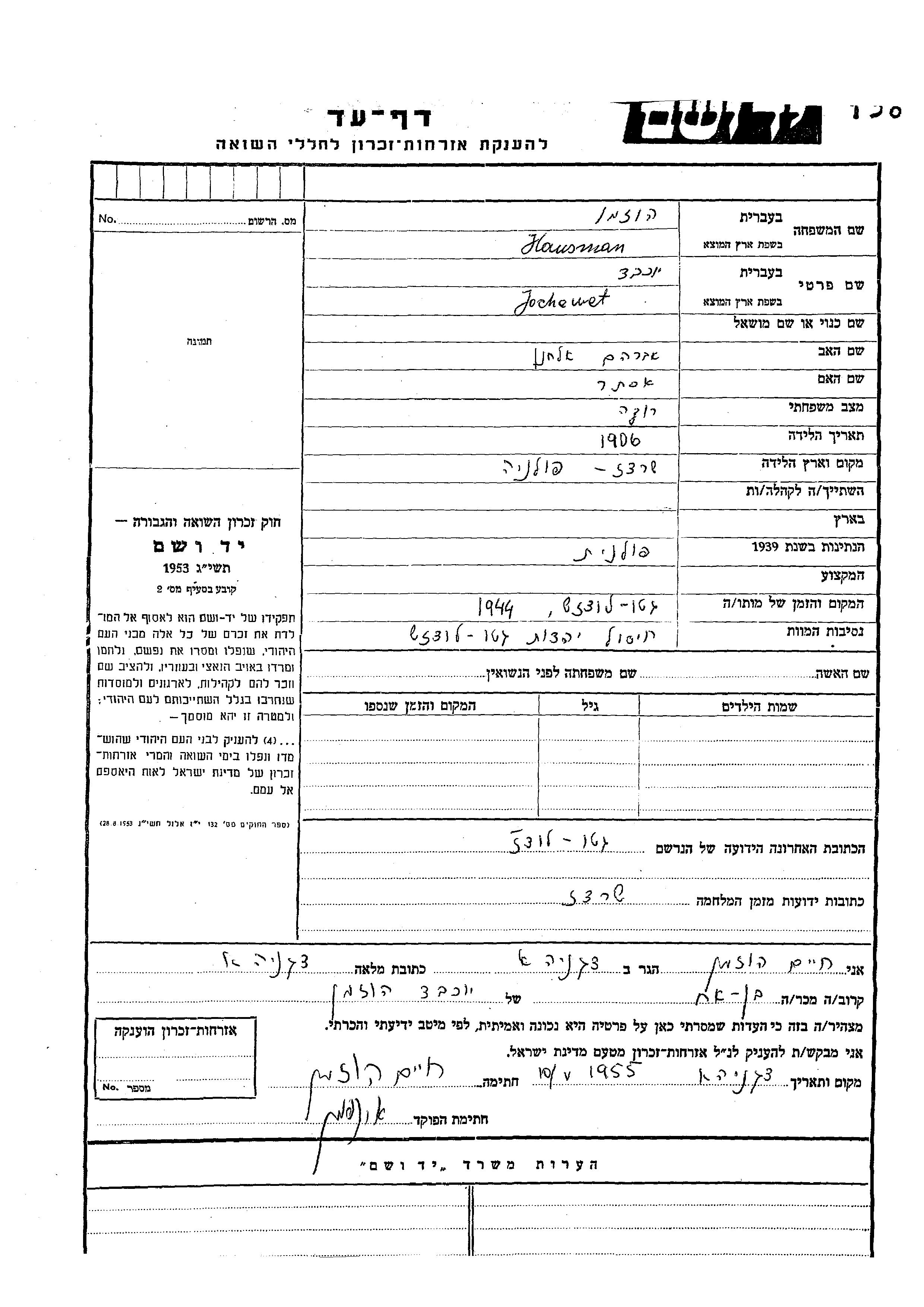 Иохевет Хаусман Хозман, место рождения: Серадз, Польша. Отец: Авраам Эльханан, mать:Эстер. Холост / не замужем. Место во время войны: Серадз, Польша.