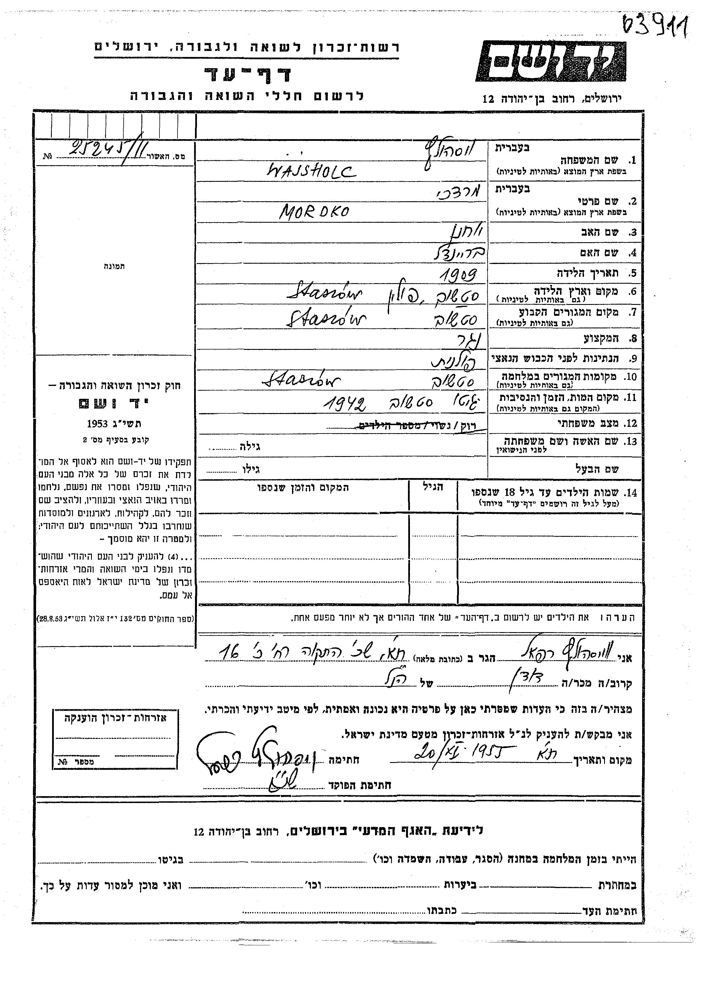 Мордко Вайсхольц, место рождения: Сташув, Польша. Отец: Иоханан, mать:Брейндл. Столяр / плотник. Холост / не замужем. Место жительства до войны: Сташув, Польша. Место во время войны: Сташув, Польша.