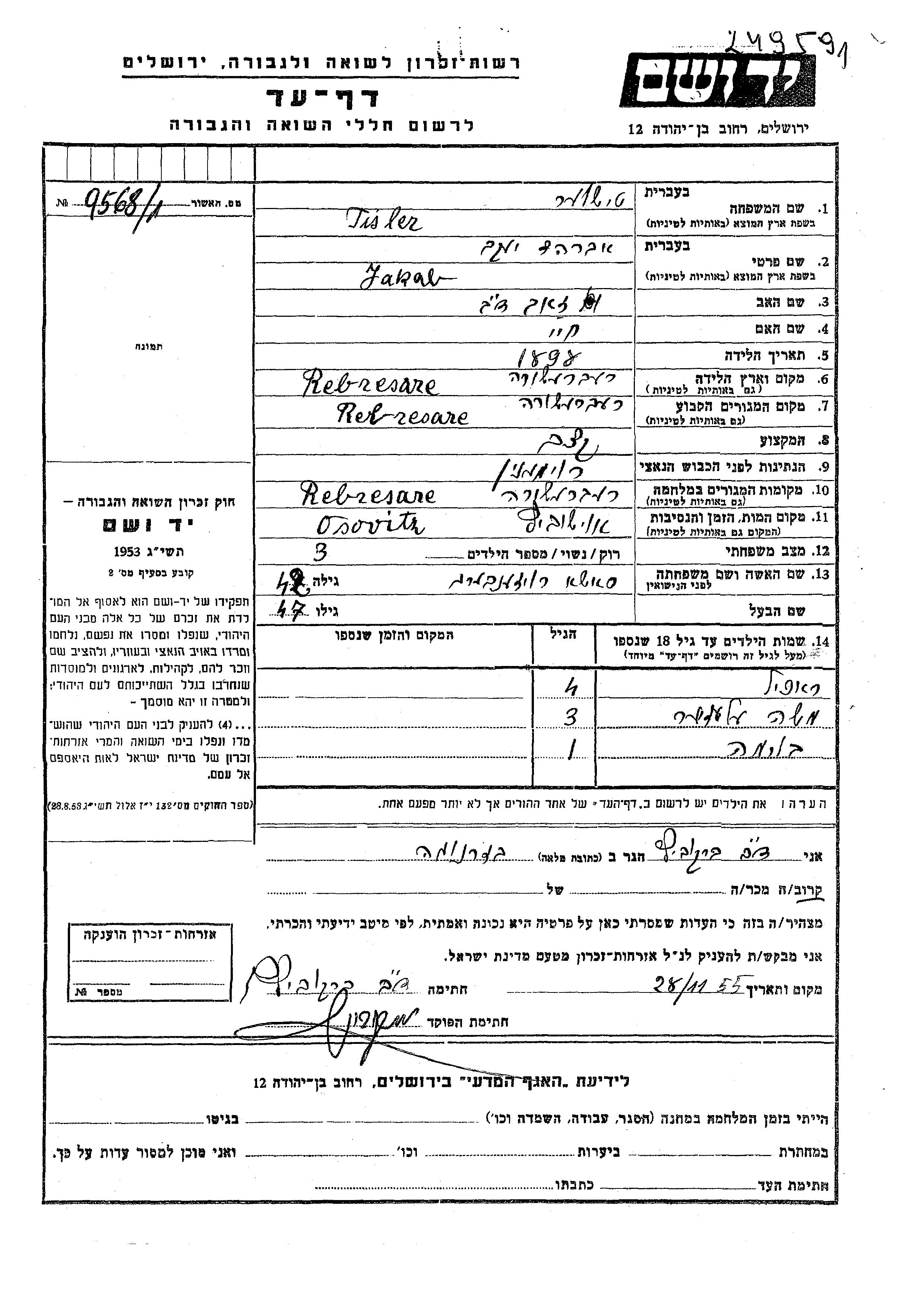 Тишлер Якаб Авраам 1898 Ребришоара, Румыния Лист свидетельских показаний