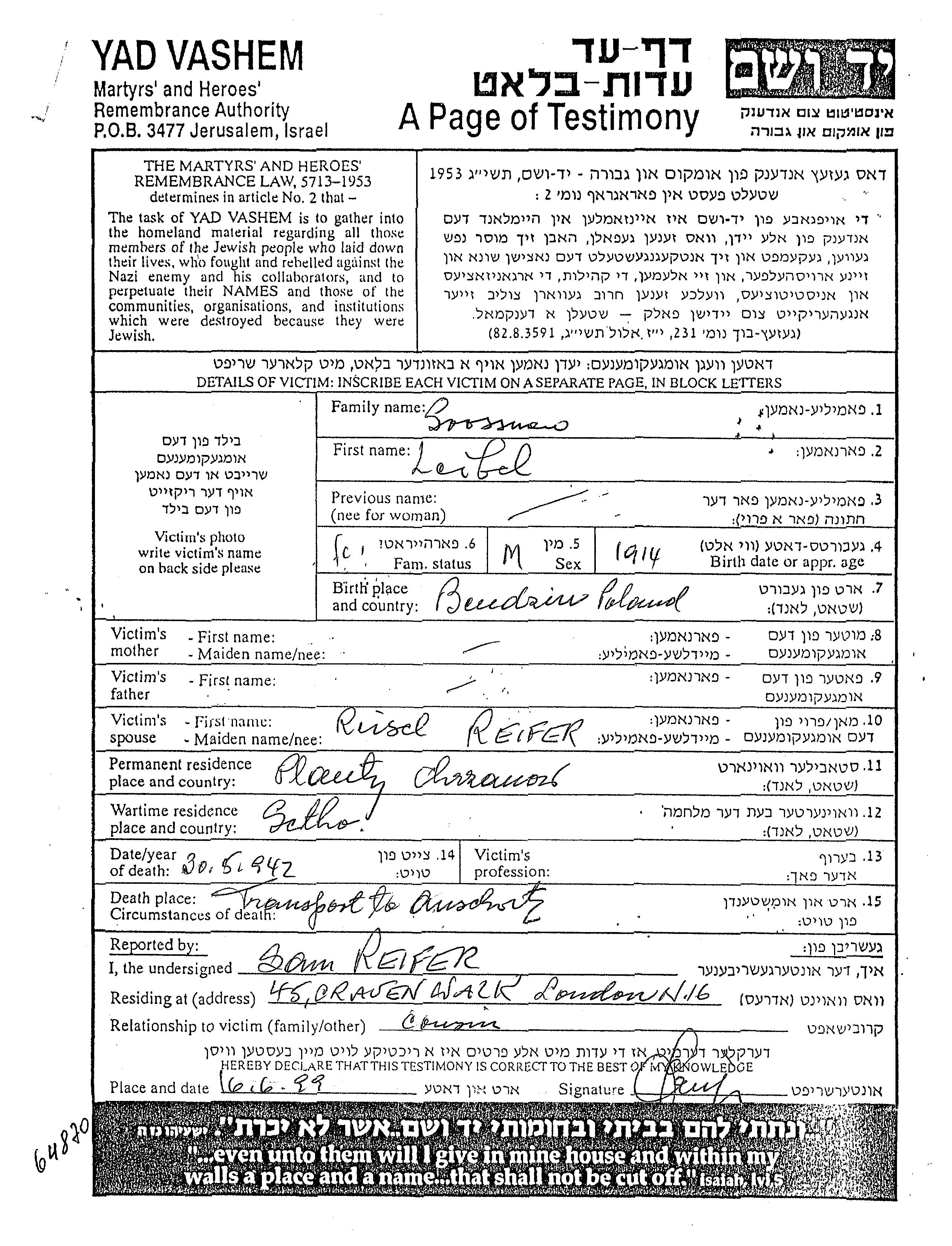 Лейбел Гроссман, место рождения: Бендзин, Польша. Женат / замужем.