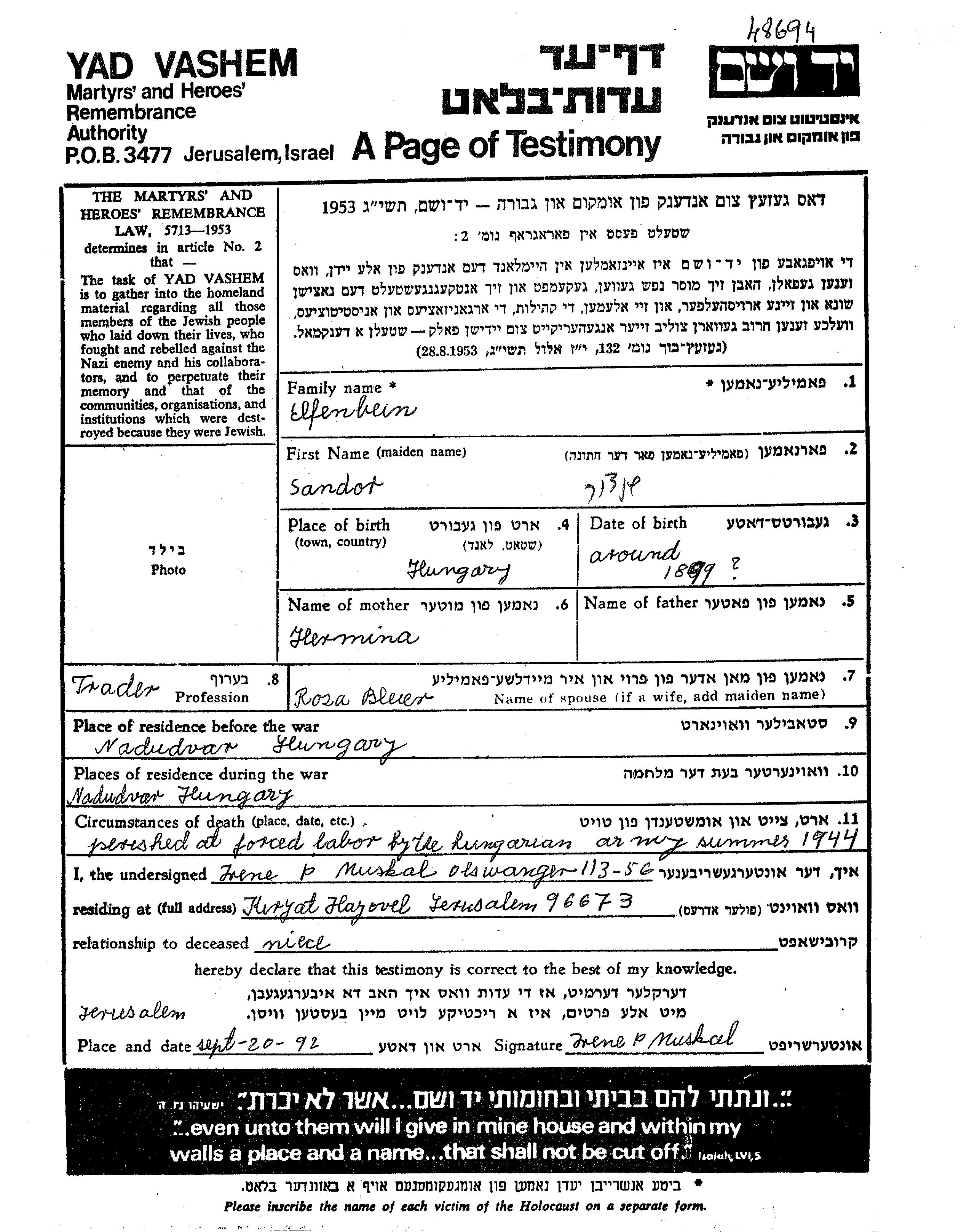 Сандор Эльфенбейн, место рождения: Венгрия.Mать:Хермина. Женат / замужем. Место жительства до войны: Надудвар, Венгрия. Место во время войны: Надудвар, Венгрия.
