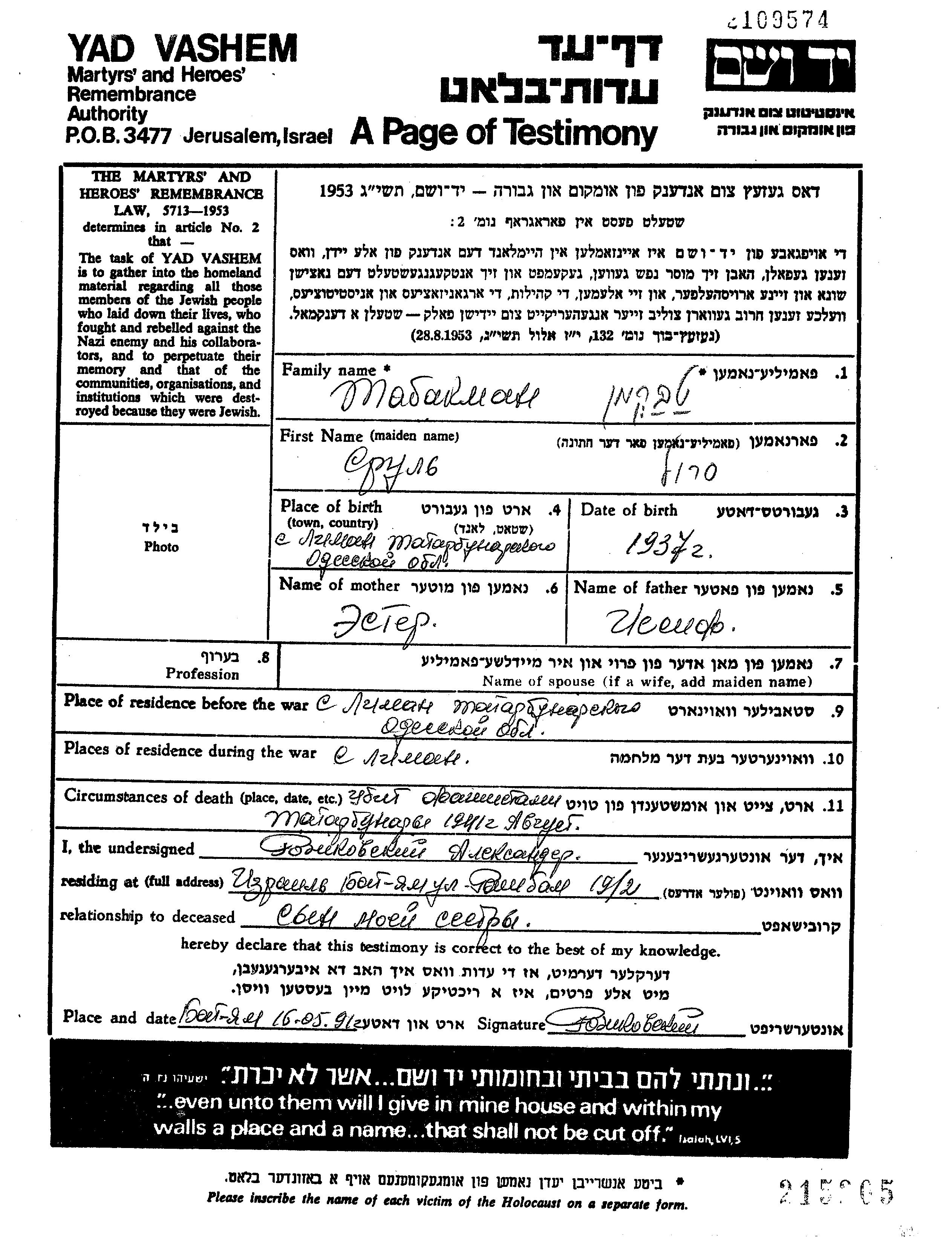 Табакман Сруль 1937 Лиман, Украина (СССР) Лист свидетельских показаний