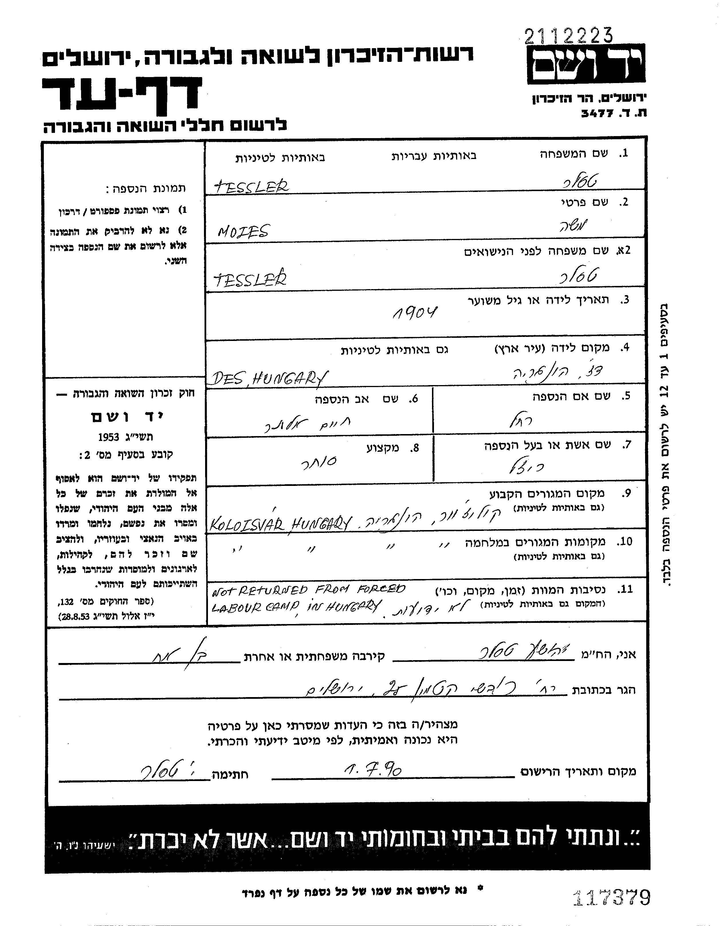 Можес Тесслер, место рождения: Деж, Румыния. Отец: Хаим Алтер Хенрик, mать:Рахель. Торговец / торговка. Женат / замужем. Место жительства до войны: Коложвар, Румыния. Место во время войны: Коложвар, Румыния.
