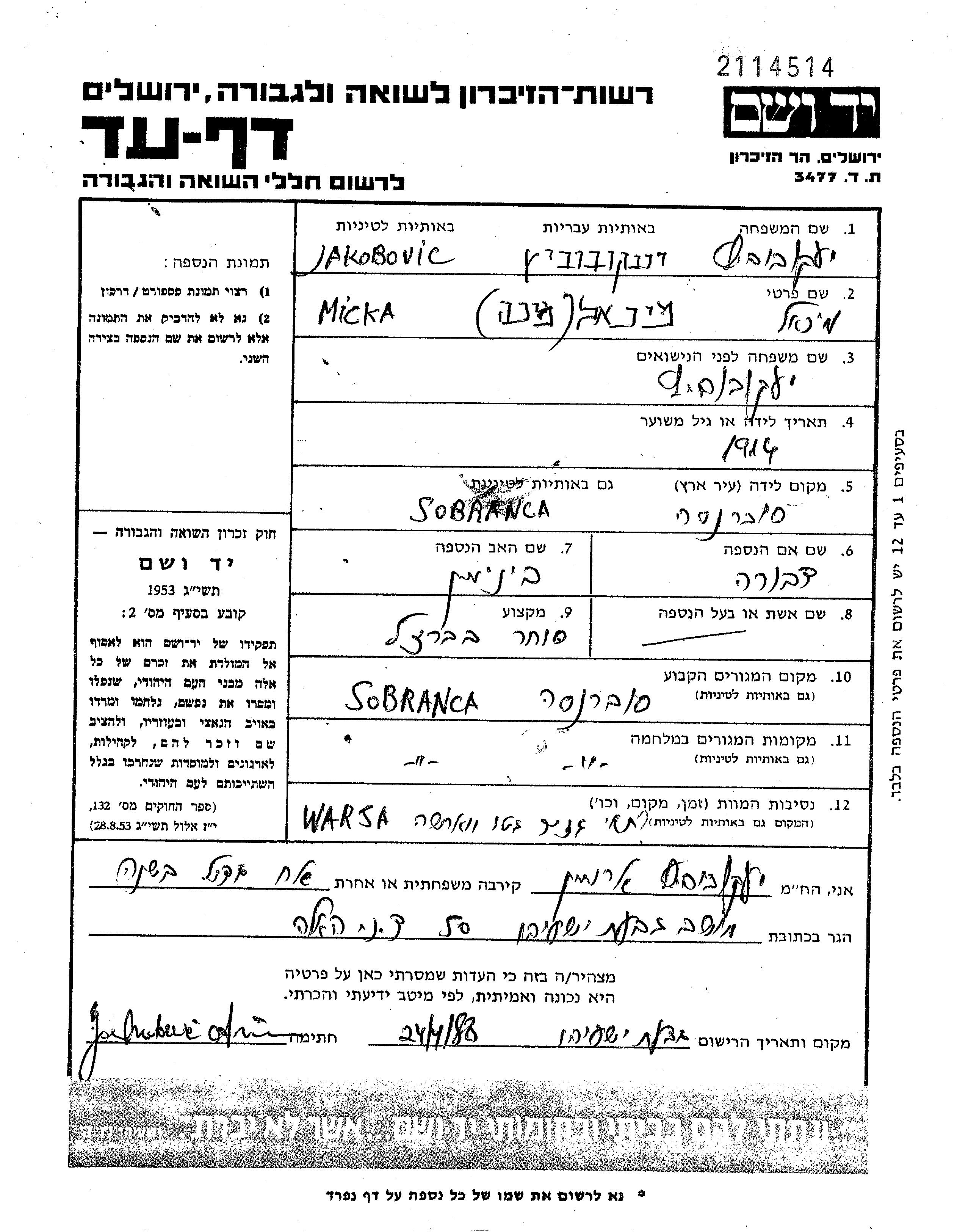 Мика Якобович, место рождения: Собранце, Чехословакия. Отец: Беямин, mать:Дебора, девичья фамилия Московиц. Холост / не замужем. Место жительства до войны: Собранце, Чехословакия. Место во время войны: Собранце, Чехословакия.