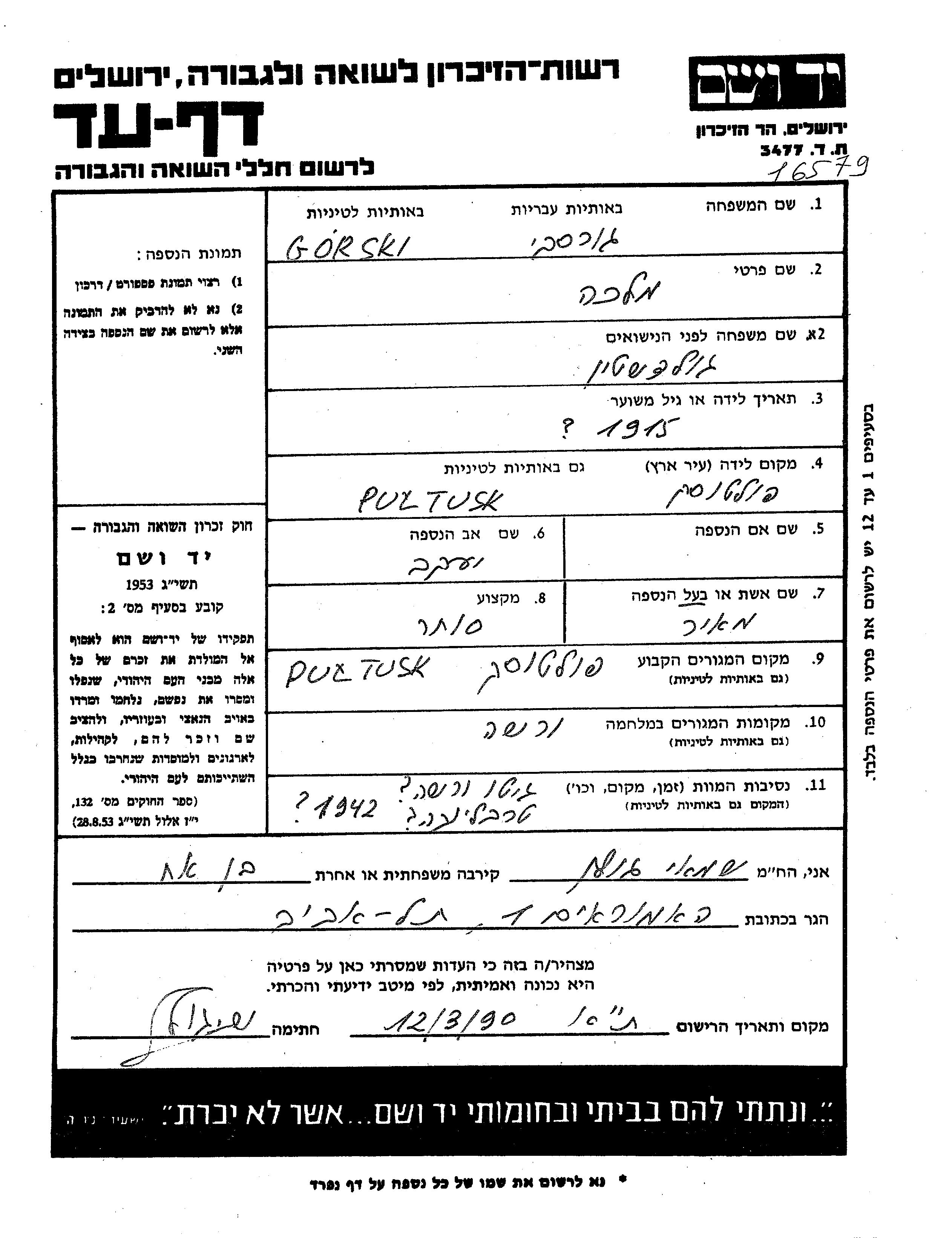 Малка Горский, девичья фамилия Гольдштейн, место рождения: Пултуск, Польша. Отец: Яков. Торговец / торговка. Женат / замужем. Место жительства до войны: Пултуск, Польша. Место во время войны: Варшава, Польша.