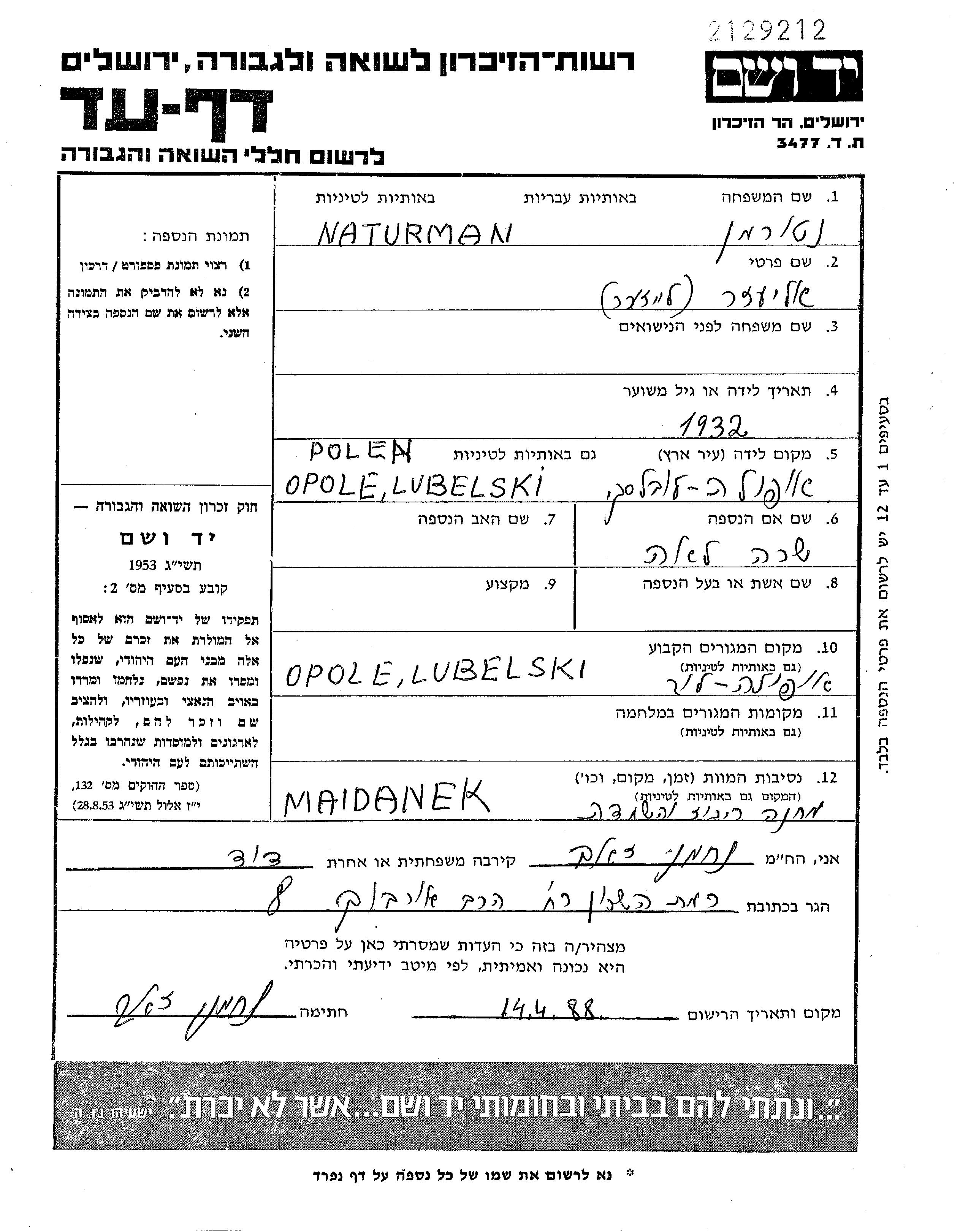 Натурман Элиэзер 1932 Ополе-Любельске, Польша Лист свидетельских показаний