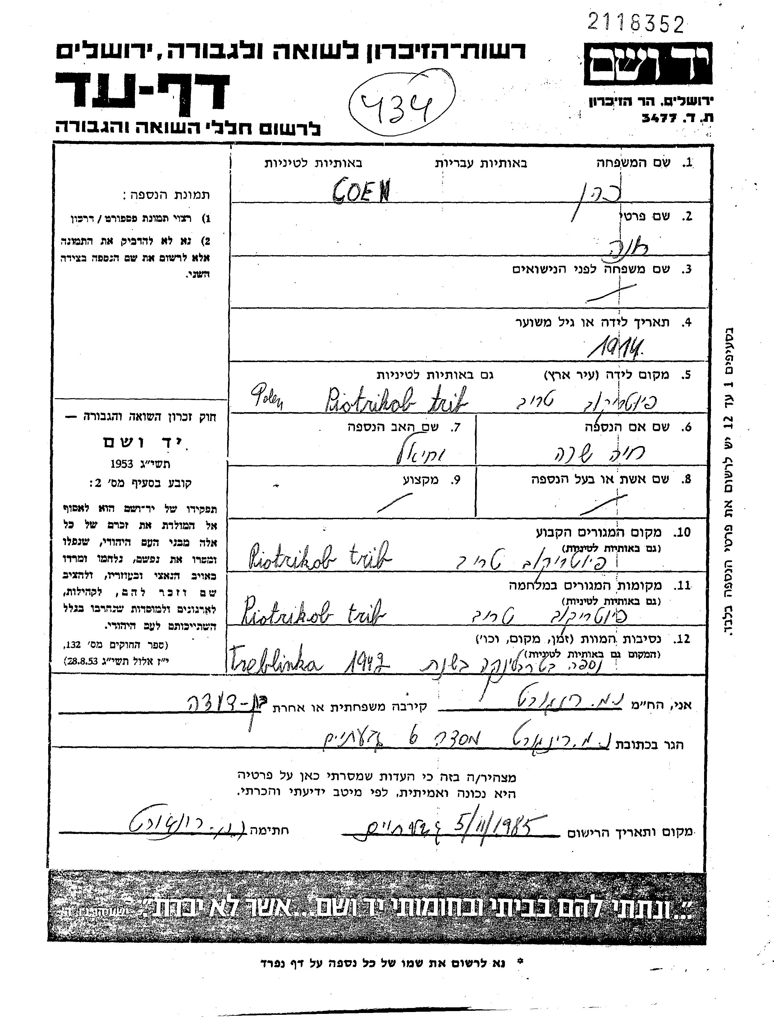 Хана Коэн, место рождения: Пётркув-Трыбунальски, Польша. Отец: Иехиэль, mать:Хая Сара, девичья фамилия Рингорт. Место жительства до войны: Пётркув-Трыбунальски, Польша. Место во время войны: Пётркув-Трыбунальски, Польша.