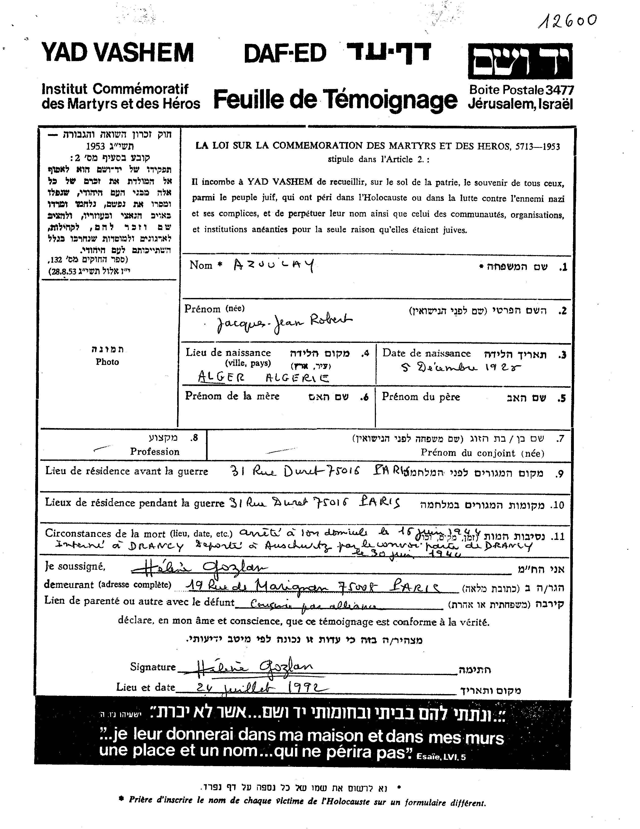 Жак Жан Роберт Азулай, место рождения: Алжир, Алжир. Отец: Беньямин Эдуард, mать:Симон Алис Элис, девичья фамилия Шемуль Шмуль. Место жительства до войны: Париж, Франция. Место во время войны: Париж, Франция.