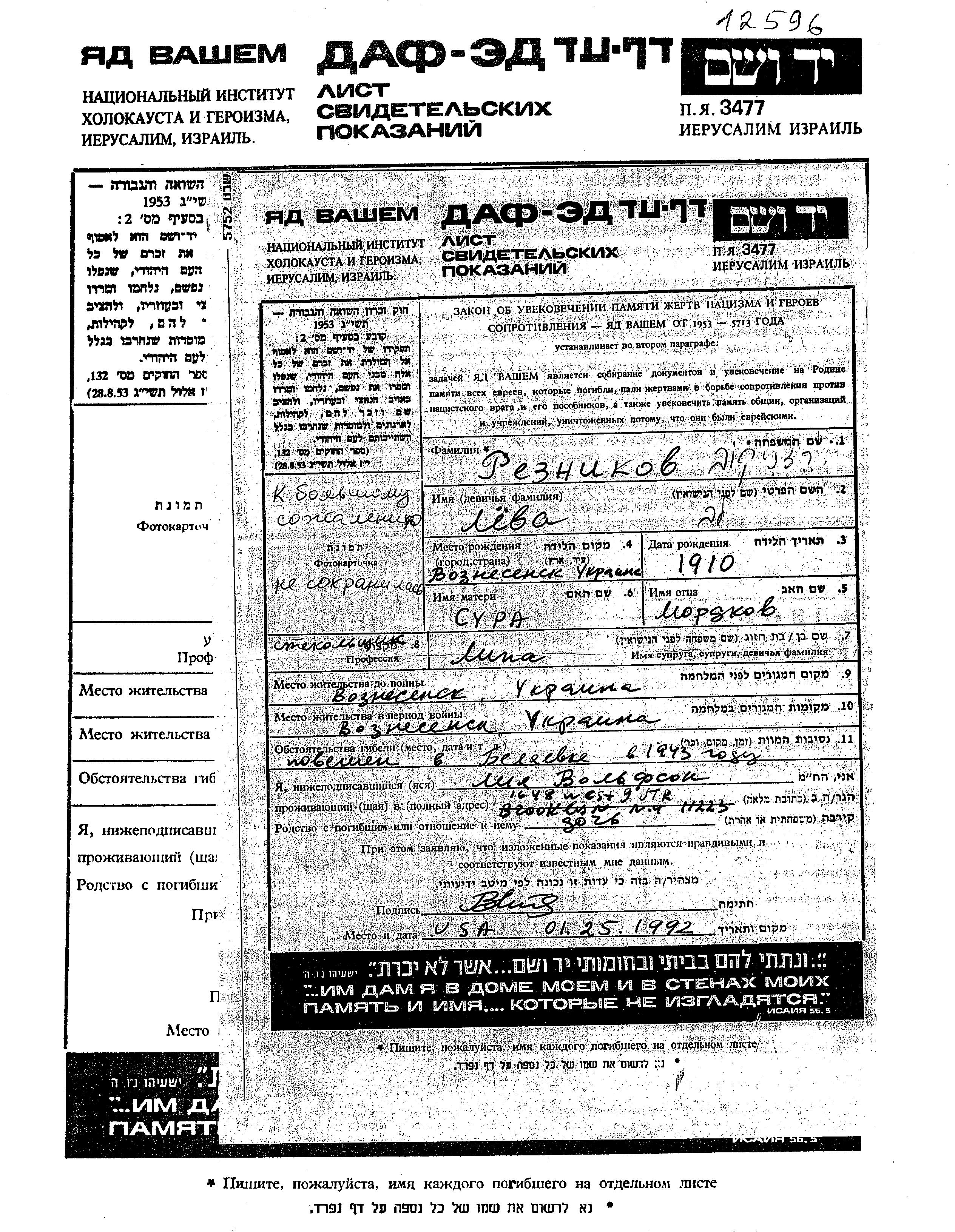 Резников Люба 1910 Вознесенск, Украина (СССР) Лист свидетельских показаний