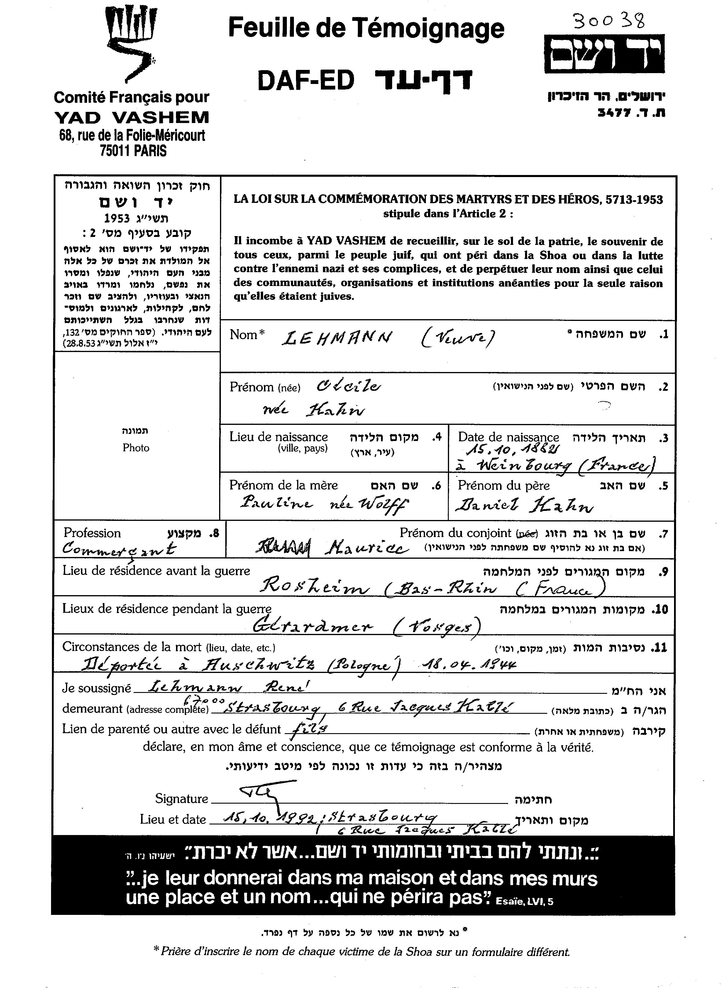 Сесиль Леман, девичья фамилия Кан Кан, место рождения: Франция. Отец: Даниэль, mать:Паулине, девичья фамилия Вольф. Торговец / торговка. Женат / замужем. Место жительства до войны: Росхейм, Франция. Место во время войны: Жерарме, Франция.