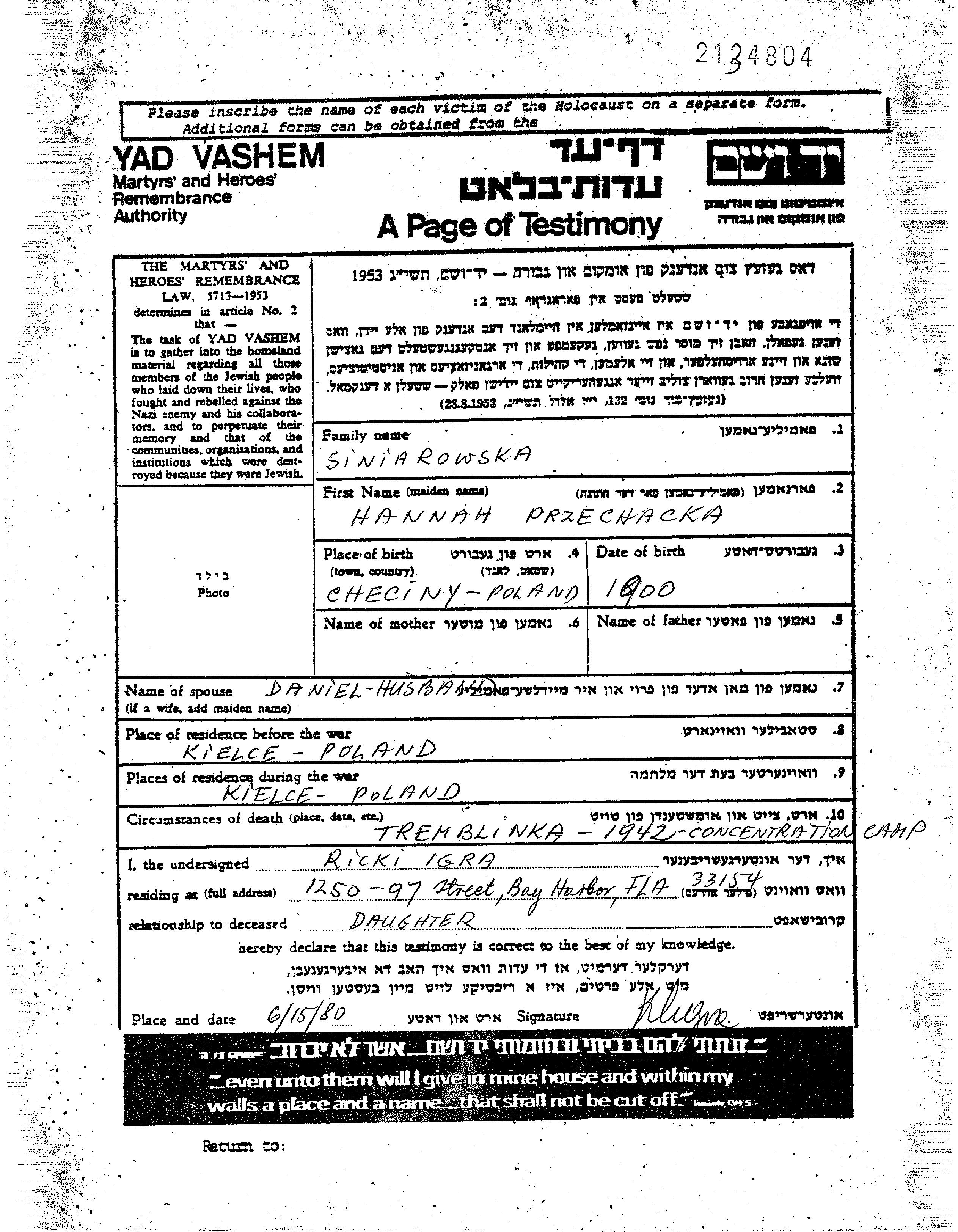 Ханна Шиняровски, девичья фамилия Пшехацки, место рождения: Хенцины, Польша. Женат / замужем. Место жительства до войны: Кельце, Польша. Место во время войны: Кельце, Польша.