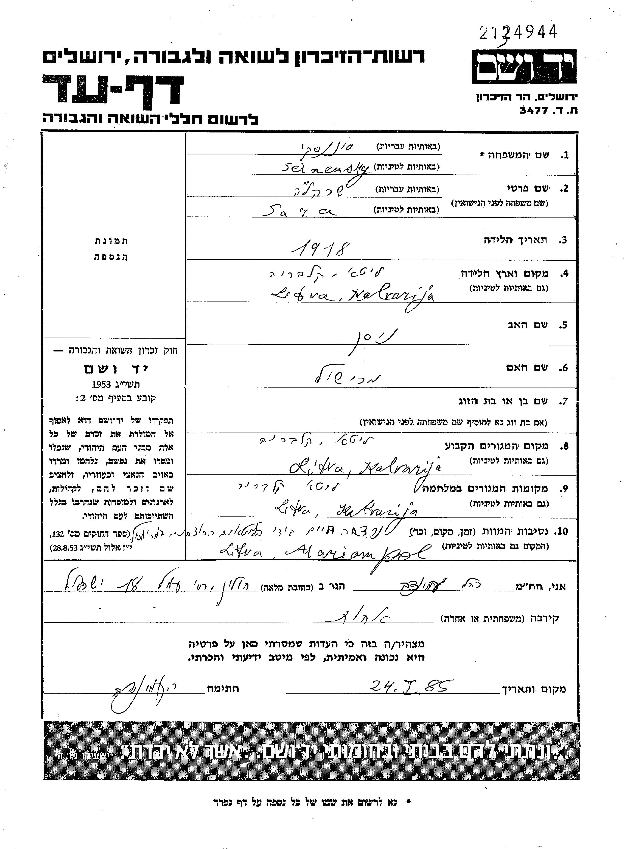 Сарале Сейненски, место рождения: Калвария, Литва. Отец: Нисан. Место жительства до войны: Калвария, Литва. Место во время войны: Калвария, Литва.