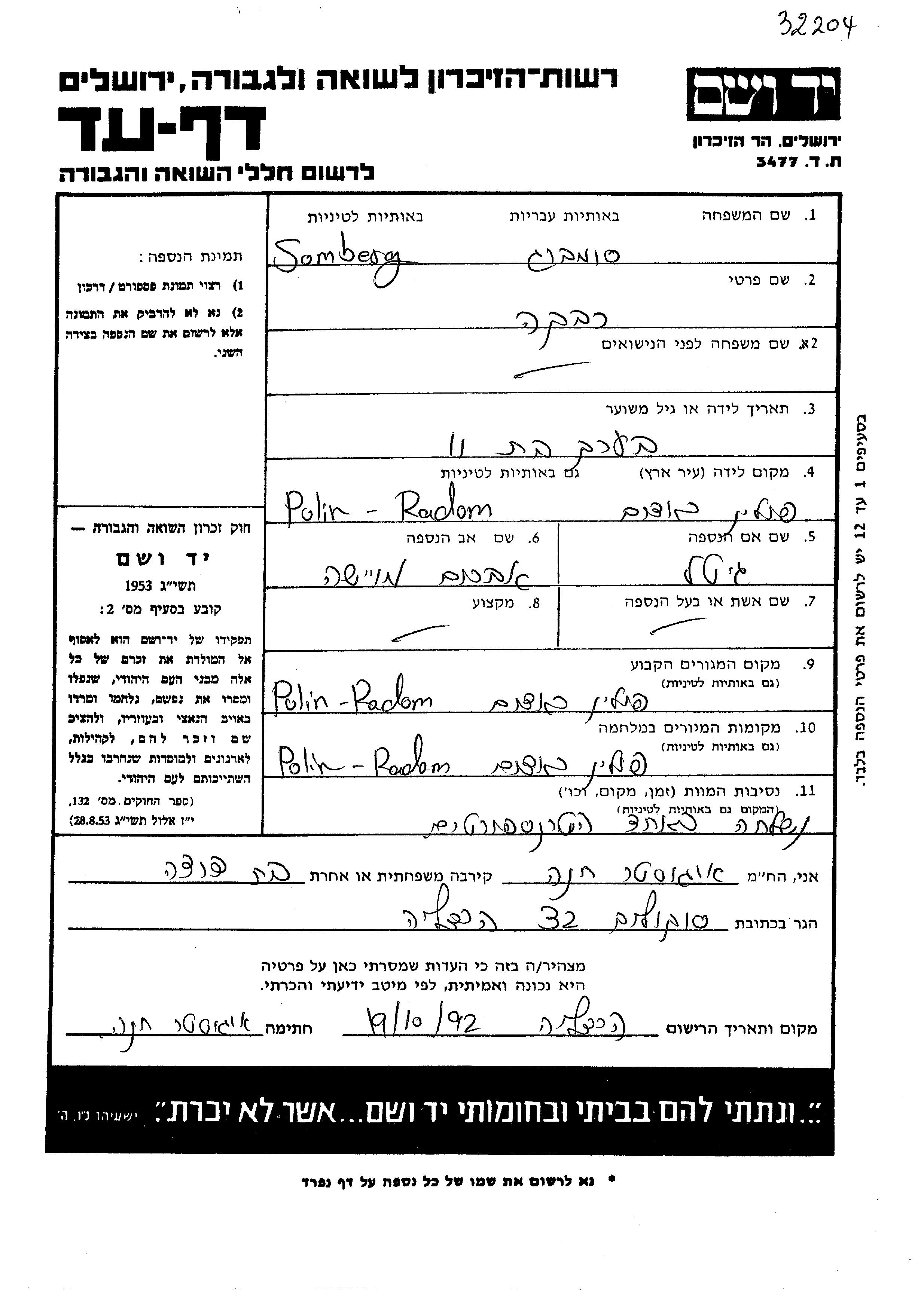 Сомберг Ривка Радом, Польша Лист свидетельских показаний