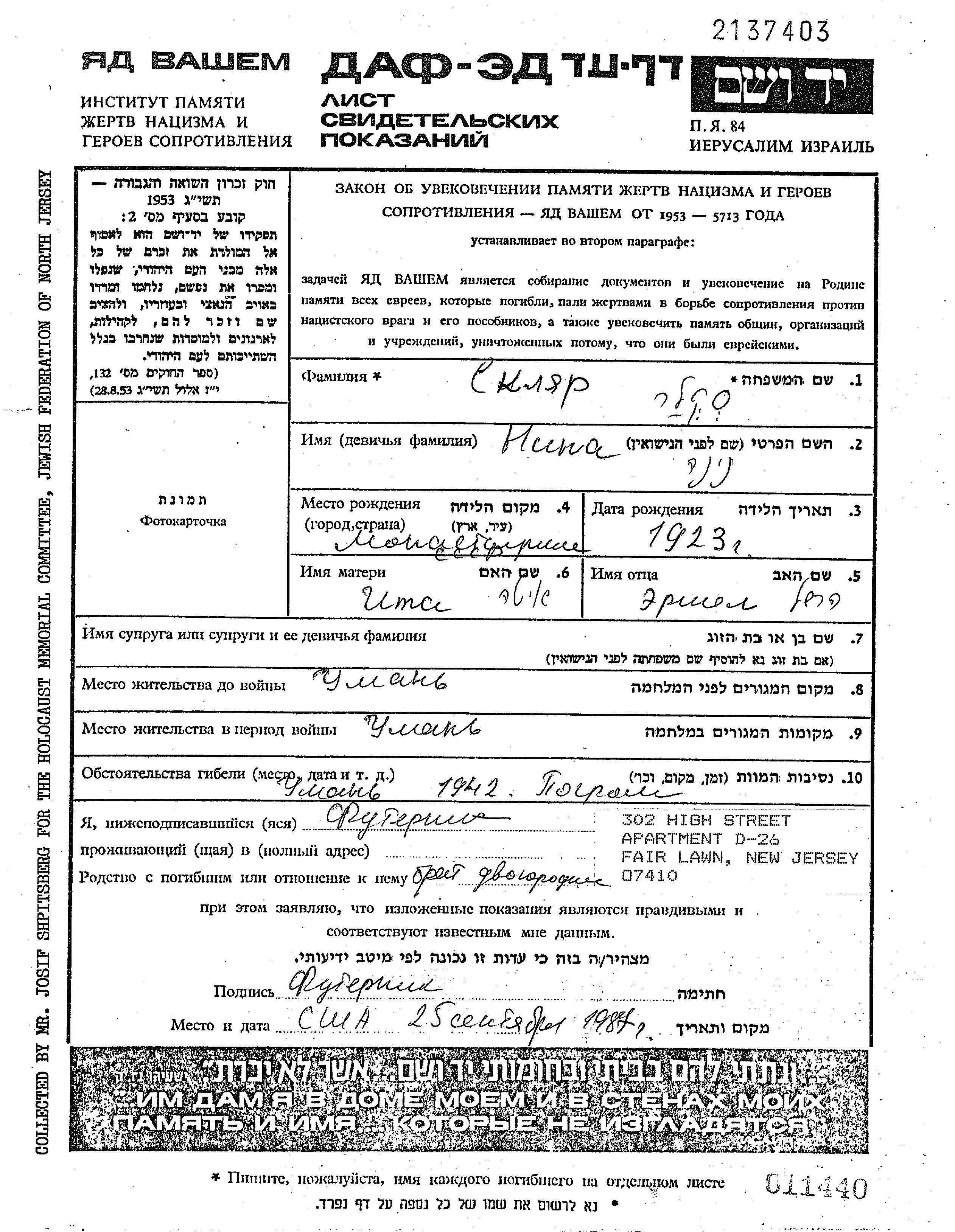 Скляр Нина Умань, Украина (СССР) Лист свидетельских показаний