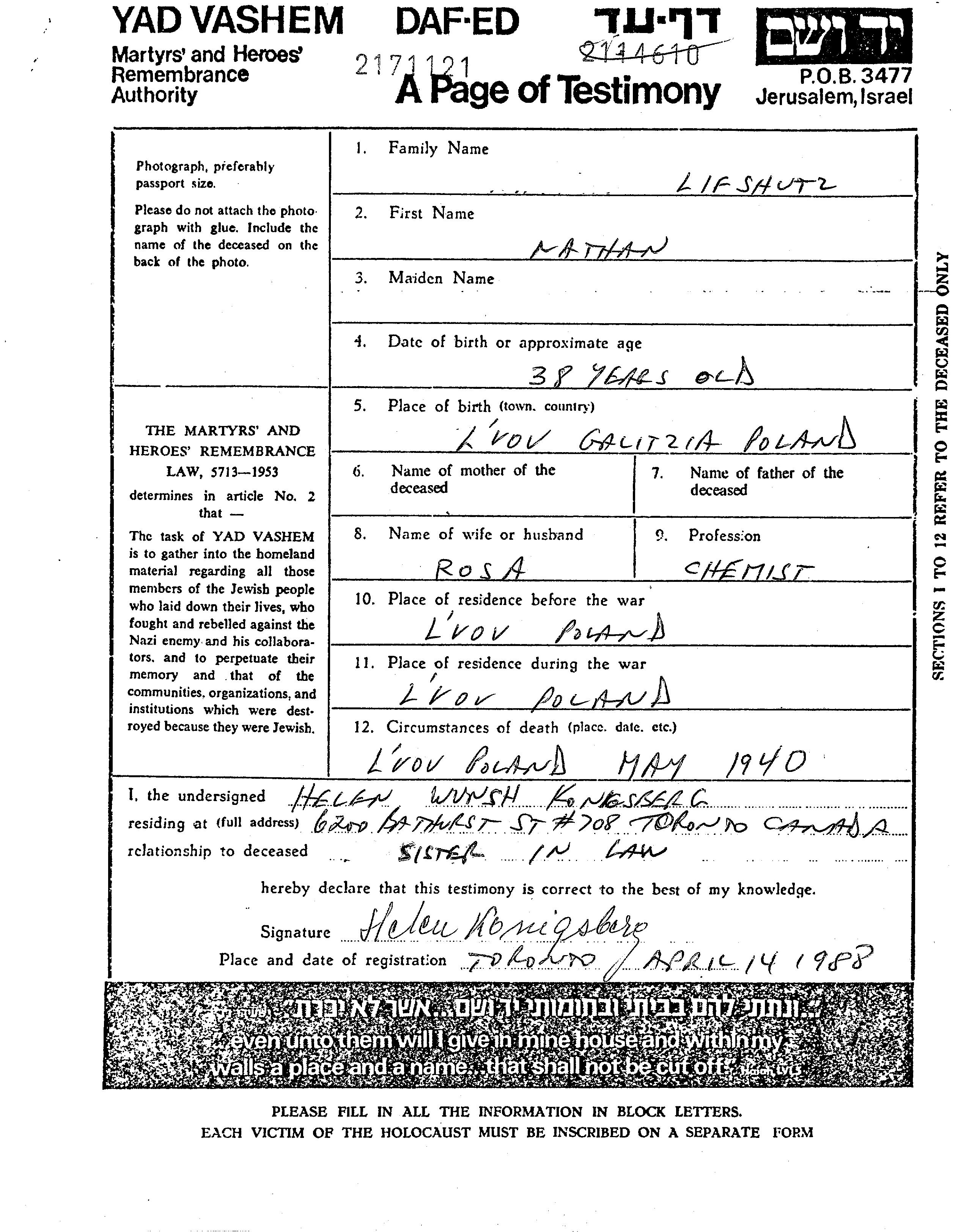 Лифшуц Натан Львов, Польша Лист свидетельских показаний