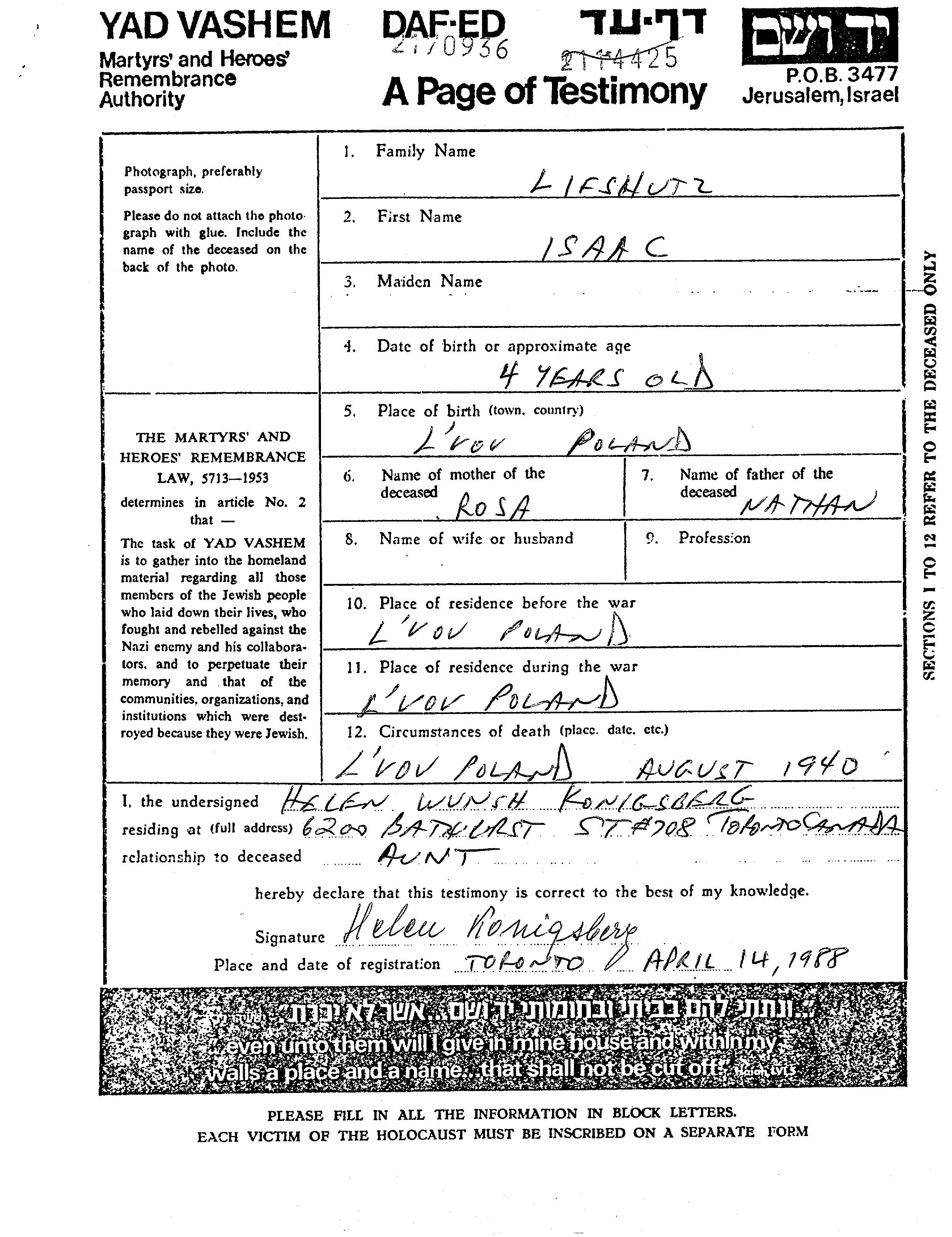 Исаак Лифшуц, место рождения: Львов, Польша. Отец: Натан, mать:Роза, девичья фамилия Вунш. Ребенок. Место жительства до войны: Львов, Польша. Место во время войны: Львов, Польша.