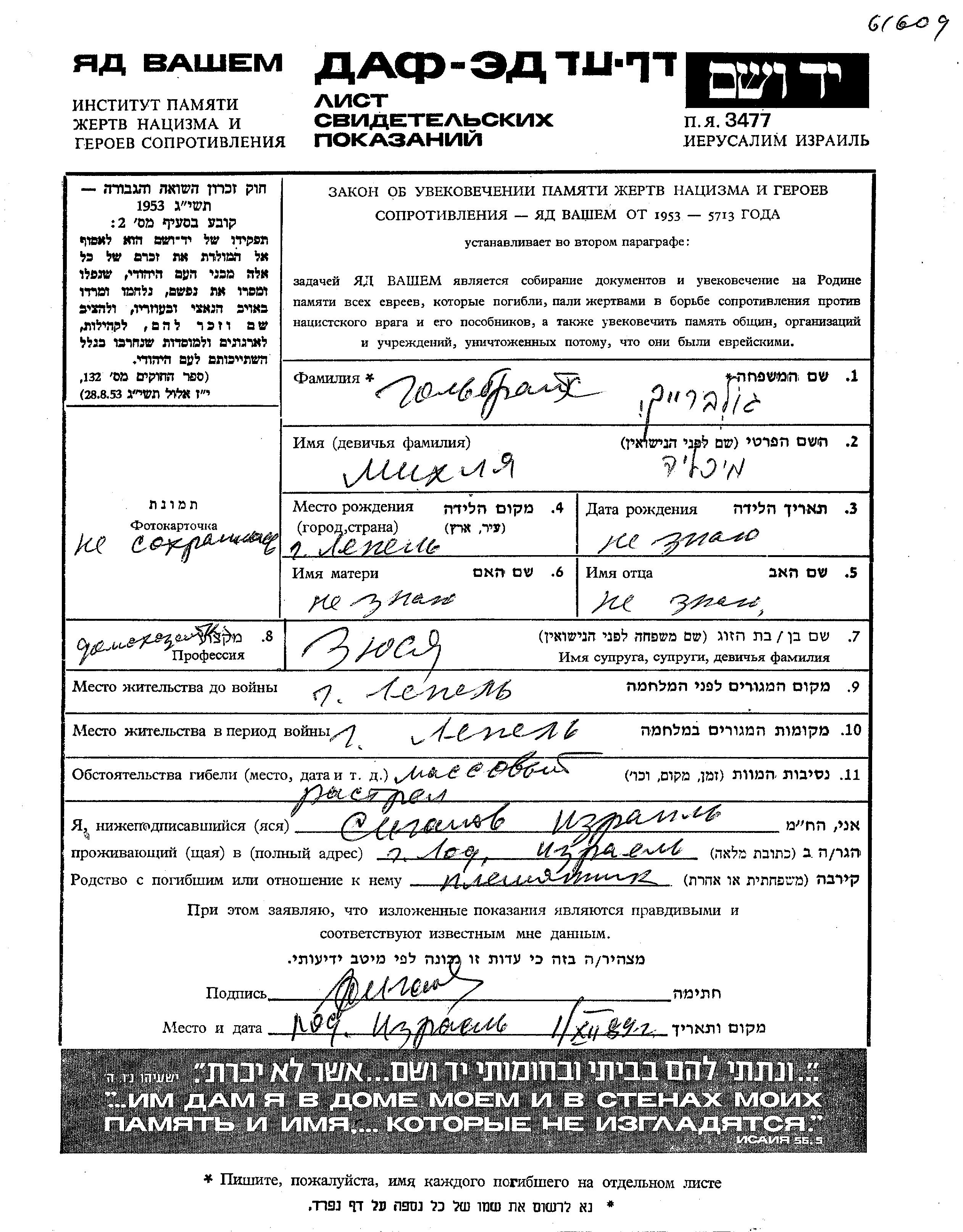 Яд Вашем - Листы свидетельских показаний Мемориального фонда