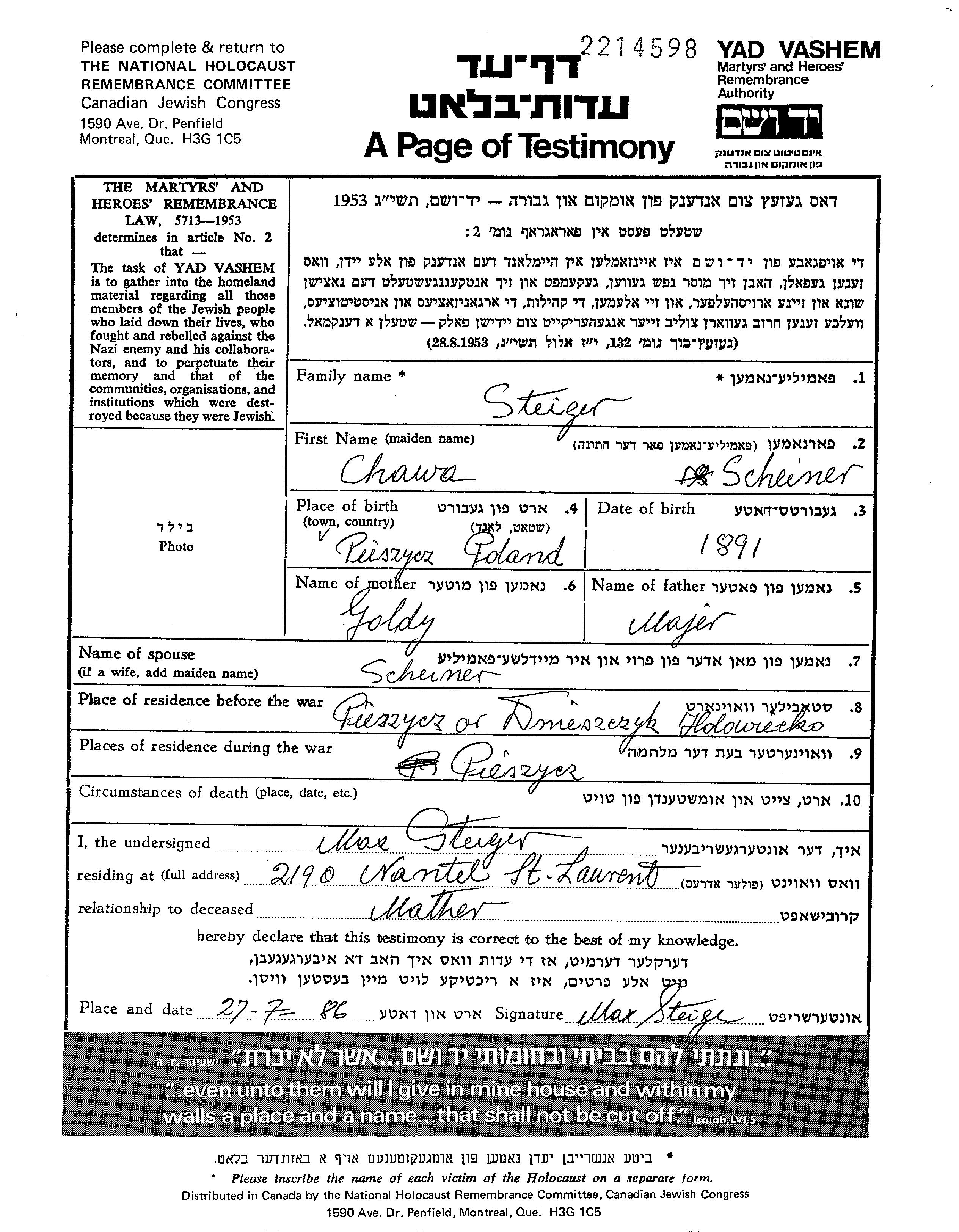 Хава Штайгер, девичья фамилия Шайнер, место рождения: Pieszyce, Германия. Отец: Маер, mать:Голди. Женат / замужем. Место жительства до войны: Pieszyce, Германия. Место во время войны: Pieszyce, Германия.