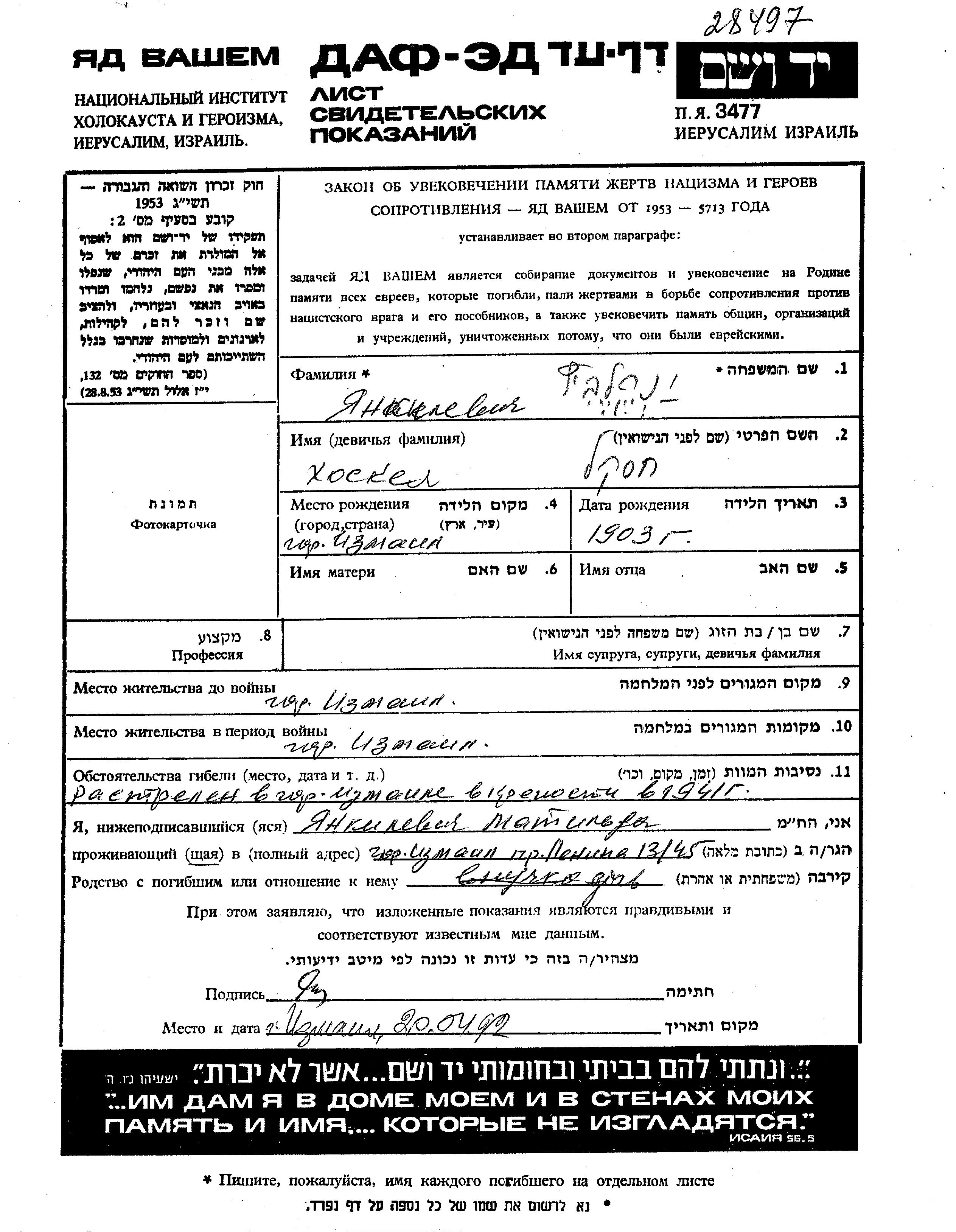 Янкилевич Хоскель 1903 Измаил, Румыния Лист свидетельских показаний