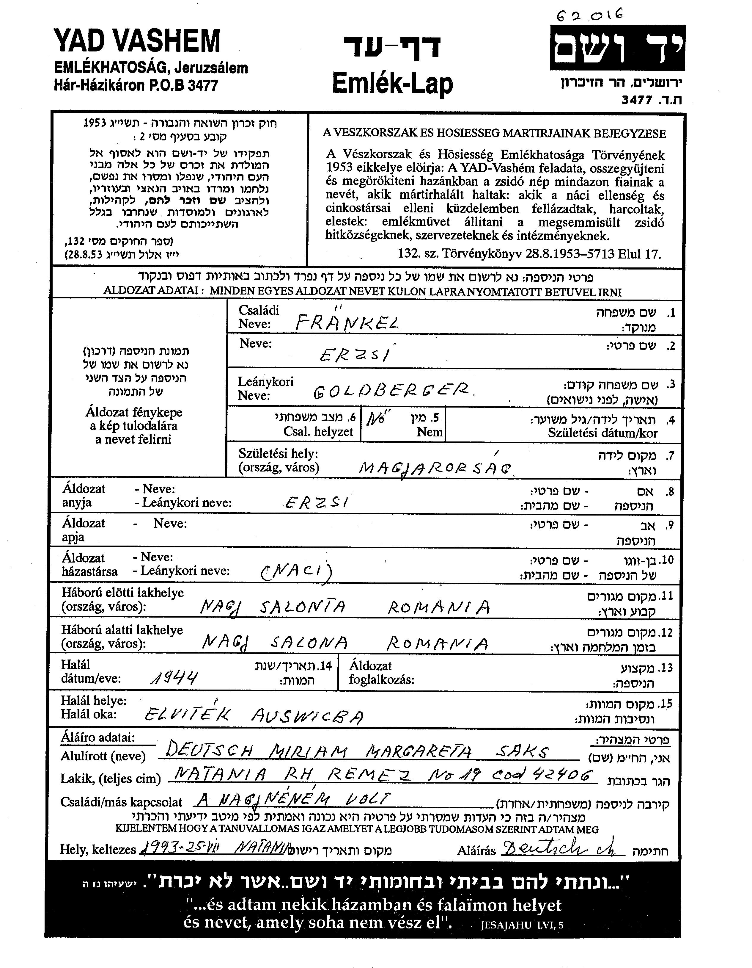 Эржи Френкель, девичья фамилия Гольдбергер, место рождения: Венгрия. Женат / замужем. Место жительства до войны: Надьсалонта, Румыния. Место во время войны: Надьсалонта, Румыния.