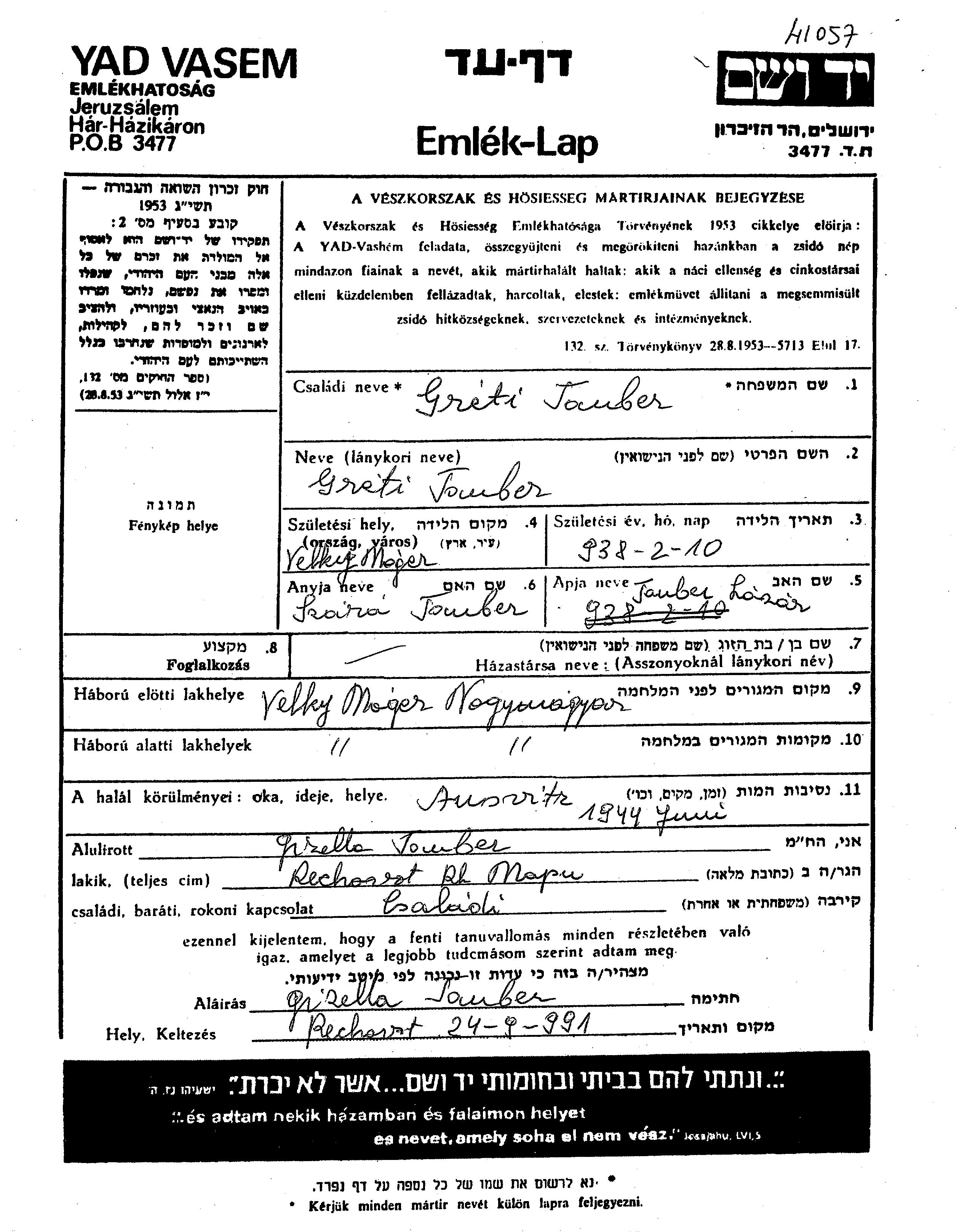 Грети Герти Таубер, место рождения: Велкий Медер, Чехословакия. Отец: Лазарь, mать:Сари, девичья фамилия Грос. Ребенок. Место жительства до войны: Велкий Медер, Чехословакия. Место во время войны: Велкий Медер, Чехословакия.