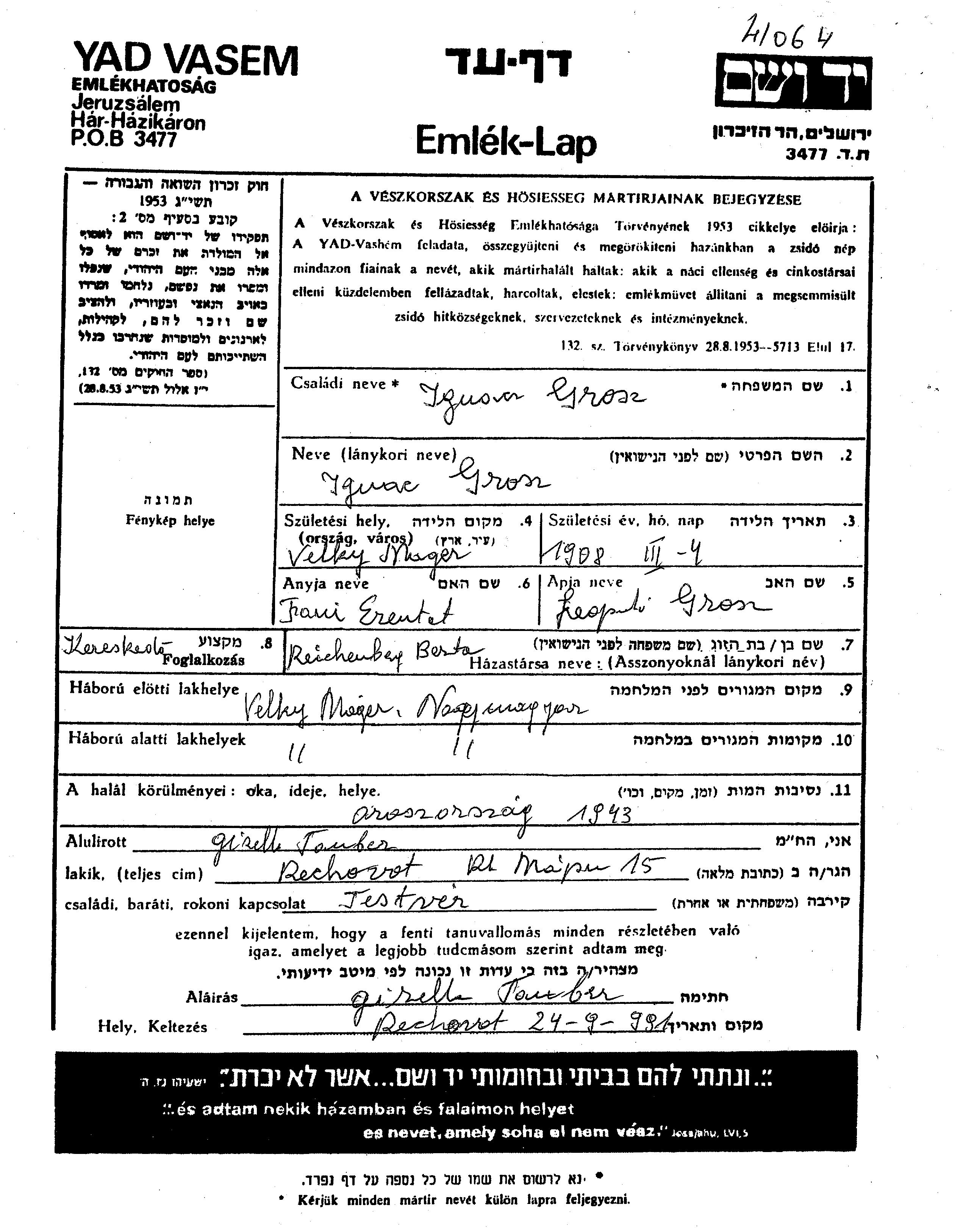 Игнац Грос, место рождения: Велкий Медер, Чехословакия. Отец: Леопольд Липот, mать:Фани Фрида, девичья фамилия Эренталь. Торговец / торговка. Женат / замужем. Место жительства до войны: Велкий Медер, Чехословакия. Место во время войны: Велкий Медер, Чехословакия.