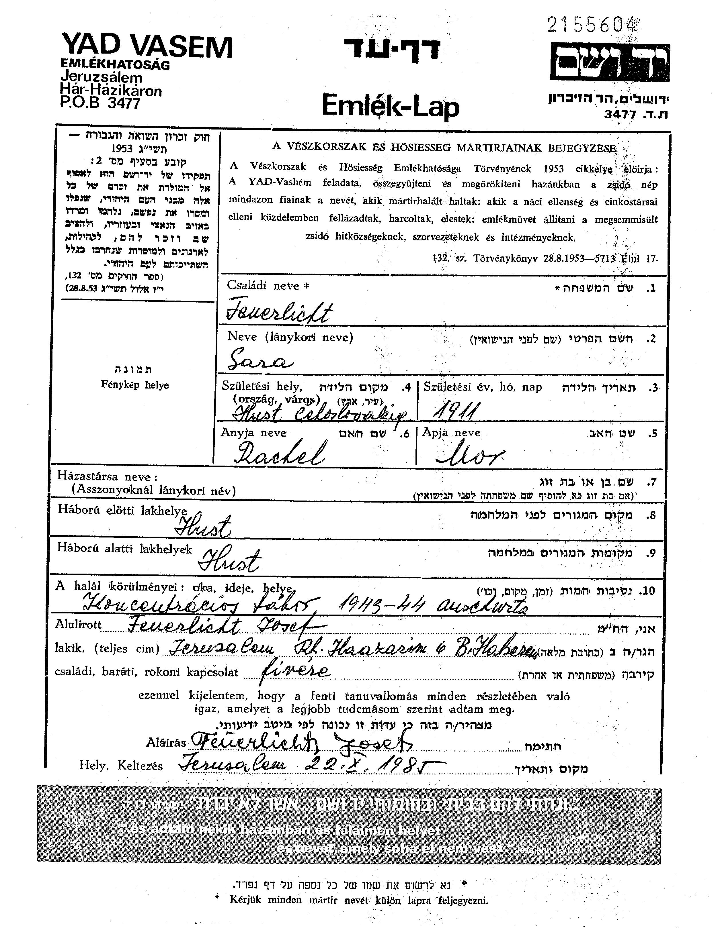 Фойерлихт Сара 1911 Хуст, Чехословакия Лист свидетельских показаний