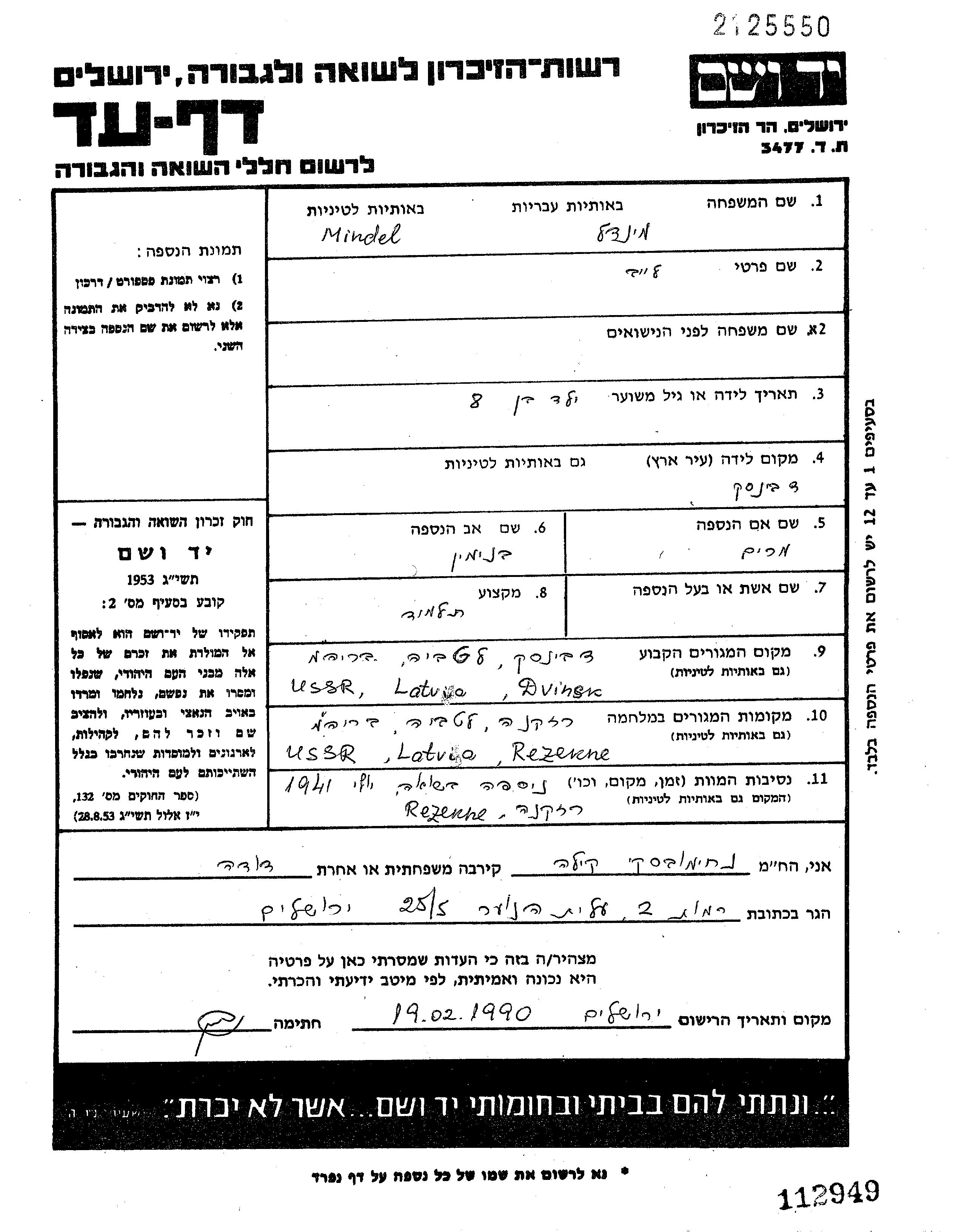 Миндель Лейб Двинск, Латвия Лист свидетельских показаний