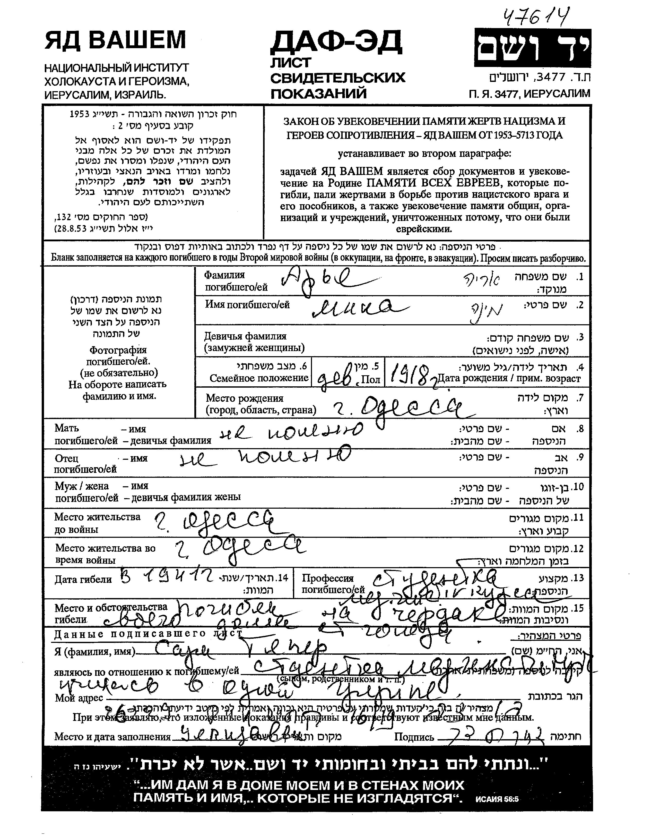 Арие Мина 1918 Одесса, Украина (СССР) Лист свидетельских показаний